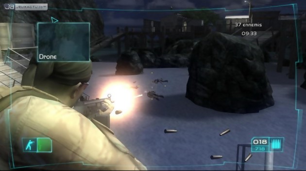 L’utilisation de la cross-com se fait entièrement par le biais de la croix directionnelle. Assez confuses et pas très bien expliquées dans le jeu, les fonctionnalités de cette cross-com permettant de garder un œil permanent sur ses co-équipiers en switchant d’un soldat à un autre via les touches droite et gauche. S’il est possible de donner des ordres, on reste néanmoins dans ce qu’il y a de plus basique : "Rejoignez" et "Regroupement". Il est également possible d’envoyer ses hommes attaquer une cible bien précise mais rien de bien plus profond en termes de choix tactique. Cela va de pair avec l’orientation résolument plus grand public vers laquelle lorgne la série depuis Ghost Recon 2. Toutefois par défaut, nos compagnons de guerre sont affûtés d’une intelligence artificielle assez honorable quoiqu’un peu confuse par moments. En effet, si ces derniers n’hésitent pas à prendre eux-mêmes leurs dispositions, il faudra parfois les recadrer pour leur éviter de rester trop longtemps à découvert ou de se mettre dans la ligne de mire, choses qu'ils semblent plutôt apprécier. L’aide se traduira parfois par la présence de chars ou de blindés qui nous épauleront lors de missions trop périlleuses pour l’infanterie. De la même manière que nos co-équipiers, il est possible de leur assigner des ordres (déplacement et tir) pour éliminer les rebelles trop coriaces. Mais ce n’est pas tout, outre les Team Mates, un autre élément tout aussi important apportera encore plus de profondeur au gameplay du jeu : le drone. Ce petit engin qui survolera les alentours depuis les hauteurs permettra aux hommes au sol de repérer les différents ennemis qui nous entourent. Attention toutefois à ne pas trop l’exposer, celui-ci peut aisément se faire abattre par l’ennemi, vous obligeant par la suite à évoluer à découvert. Le cas échéant, mieux vaut faire passer son drone en mode supérieur pour le mettre à l’abri des tirs trop vicieux. Gérables en fonction du réticule de visée, tous ses partenaires peuvent également se rendre à un point précis de la ville en indiquant tout simplement la direction à prendre par la biais de la carte stratégique, de la même manière qu'un RTS. Bien utile pour repérer les points stratégiques.