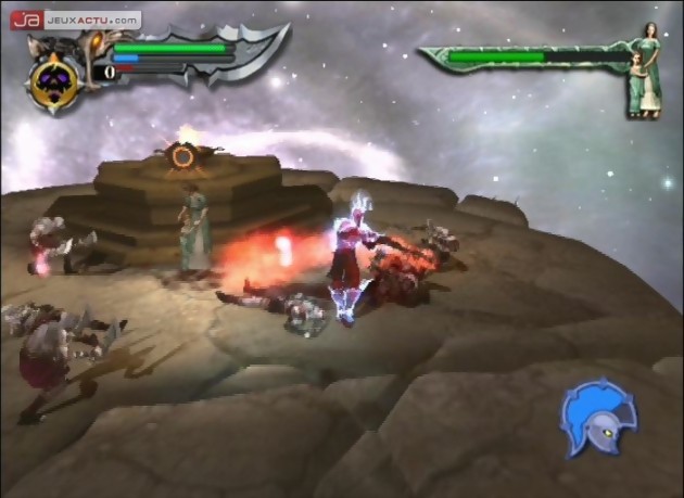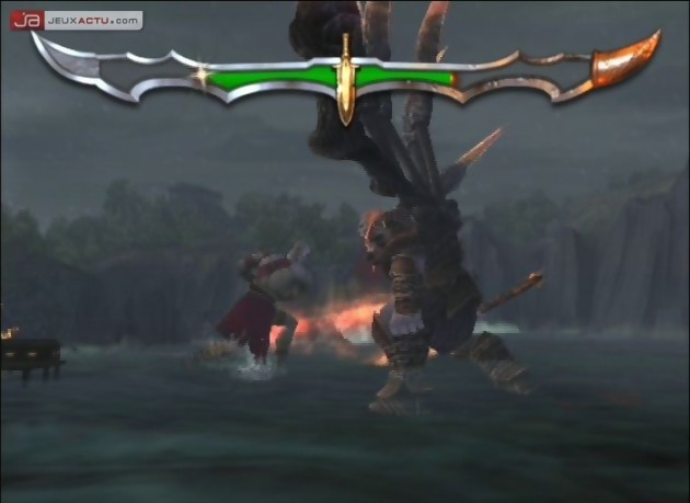 Bien évidemment, toute cette créativité mise dans le scénario et la mise en scène du jeu ne serait que pure perte si son gameplay n’était pas à la hauteur. Fort heureusement, il n’est est rien, bien au contraire. Articulée sur une base extrêmement simple (coup faible, coup fort, chope), l’étendue de vos coups va vite s’enrichir de mouvements plus puissants, de nouvelles possibilités de combos, de sorts magiques et même par la suite d’une… Non, finalement, je ne vous le dis pas. Toujours est-il que les coups et les combos sont très faciles à sortir et que les chopes permettent de finir vos adversaires de trois manières différentes, toutes aussi horribles les unes que les autres. A cela s’ajoutent des combats avec certaines créatures où vous devrez respecter des séquences de touches ou tapoter frénétiquement sur l’une d’entre elles pour achever un ennemi en difficulté. De même, il vous faudra parfois utiliser les éléments du décor pour vaincre. Mais God of War ne se contente pas d’enfiler les phases d’action comme d’autres le font avec les perles, auquel cas le jeu aurait pu devenir un poil saoulant. Vous aurez également droit à de la plate-forme et il conviendra d’être précis, ce qui, judicieusement placé après une séquence d’action non-stop, demandera pas mal de sang froid. Des petites énigmes, pas très difficiles mais plutôt astucieuses en général, vous seront aussi proposées sur votre chemin. Même dans l’action, God of War sait varier les plaisirs, entre gameplay horizontal et vertical, espaces ouverts et fermés, ennemis en surnombre et boss (bien qu’on en aurait voulu un chouia plus) bien typés.