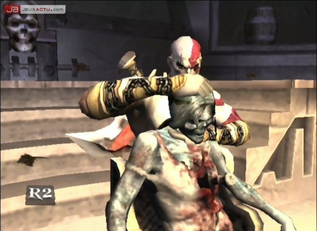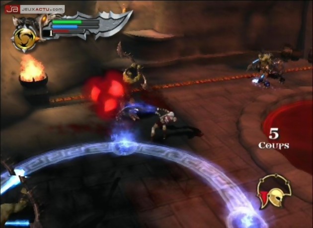 Bien évidemment, toute cette créativité mise dans le scénario et la mise en scène du jeu ne serait que pure perte si son gameplay n’était pas à la hauteur. Fort heureusement, il n’est est rien, bien au contraire. Articulée sur une base extrêmement simple (coup faible, coup fort, chope), l’étendue de vos coups va vite s’enrichir de mouvements plus puissants, de nouvelles possibilités de combos, de sorts magiques et même par la suite d’une… Non, finalement, je ne vous le dis pas. Toujours est-il que les coups et les combos sont très faciles à sortir et que les chopes permettent de finir vos adversaires de trois manières différentes, toutes aussi horribles les unes que les autres. A cela s’ajoutent des combats avec certaines créatures où vous devrez respecter des séquences de touches ou tapoter frénétiquement sur l’une d’entre elles pour achever un ennemi en difficulté. De même, il vous faudra parfois utiliser les éléments du décor pour vaincre. Mais God of War ne se contente pas d’enfiler les phases d’action comme d’autres le font avec les perles, auquel cas le jeu aurait pu devenir un poil saoulant. Vous aurez également droit à de la plate-forme et il conviendra d’être précis, ce qui, judicieusement placé après une séquence d’action non-stop, demandera pas mal de sang froid. Des petites énigmes, pas très difficiles mais plutôt astucieuses en général, vous seront aussi proposées sur votre chemin. Même dans l’action, God of War sait varier les plaisirs, entre gameplay horizontal et vertical, espaces ouverts et fermés, ennemis en surnombre et boss (bien qu’on en aurait voulu un chouia plus) bien typés.