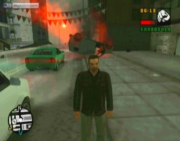 Une fois le décor, il est temps de s’occuper un peu de la réalisation de Grand Theft Auto : Liberty City Stories qui va sans dire se rapprocher inévitablement de l’opus PlayStation Portable. Une fois de plus le terme « simple conversion » n’est peut-être pas si anodine que ça. En effet, alors que la version PlayStation Portable honorait avec brio l’écran 16/9ème de la console nomade de Sony, le résultat est quelque peu décevant ici. N’imaginez pas que Rockstar Games a complètement remanier le moteur graphique du jeu afin qu’il s’apparente à un Grand Theft Auto : San Andreas. Même si le moteur graphique n’a pas tant évolué que ça depuis Grand Theft Auto 3, les développeurs de Manhunt ont tout même chercher à créer des nouveaux effets tout en agrandissant la ville. Et ces jeux de lumière qui collaient à la peau de CJ sont absents des aventures de Toni Cipriani. C’est un petit peu le serpent qui se mord la queue. J’entends par là que si GTA : Liberty City Stories a su exploiter et affiner les graphismes de GTA III, cette mouture revient aux prémices de la 3D dans la série GTA. Cela se ressent essentiellement au niveau du frame-rate qui n’a pas aimé le changement de format. Plutôt fluide sur PSP, la version PS2 affiche de grosses lacunes et lorsque la pluie et le brouillard s’y mêlent, on s’en arracherait presque les cheveux. Autre problème, l’aliasing. En comparaison avec