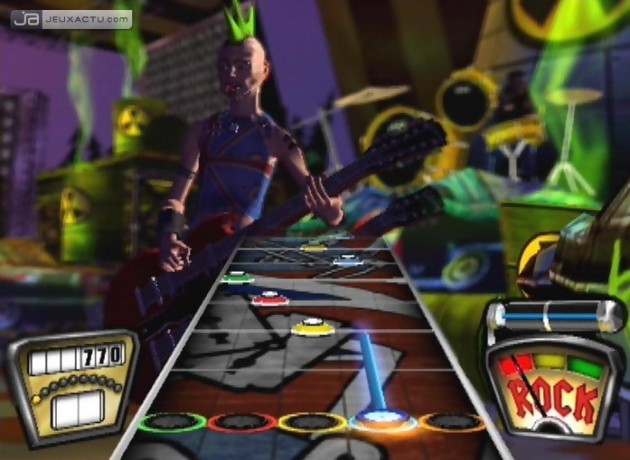 Le concept de Guitar Hero est on ne peut plus simple. Après avoir pris le soin de choisir son rockeur fou, le but est de gravir les différents échelons du milieu pour devenir un guitariste de renom et par la même occasion faire la couverture des magazines de rock les plus en vogue. Gratter les notes qui défilent à l’écran au bon moment, voilà qui semble plutôt facile sur le papier. Seulement une fois la guitare en main, l’exercice s’avère être plus corsé que prévu, d’autant que la difficulté monte crescendo en fonction du mode de difficulté sélectionné : "Facile", "Moyen", "Difficile" et "Expert". Non, il est fortement conseillé de passer par le tutorial, passage obligatoire pour comprendre les quelques subtilités du jeu. Un peu à la manière d’un Donkey Konga, l’astuce est ici de valider les notes de couleur qui circulent à l’écran. Chaque note colorée correspond à l’une des 5 touches que l’on retrouve sur le manche de la guitare. Pour ce faire, il faut simplement maintenir la touche adéquate et gratter au moment opportun. En avançant dans le jeu, on apprend aussi à réaliser des accords, en maintenant deux boutons en même temps. Quant aux notes longues, il suffit simplement de laisser les touches enfoncées, sans oublier de faire fonctionner son vibrato, histoire de faire grimper son score de quelques points précieux. Le score s’établit en fonction du Rock Meter, ce petit boîtier en forme d’ampli situé en bas à droite de l’écran et qui nous informe des compétences du guitariste en prestation. Si l’aiguille venait à descendre plus bas que le seuil autorisé (zone rouge), le morceau s’arrête sur le champ, laissant le musicien aux mains d’un public qui n’hésite pas à faire valoir son mécontentement. A l’inverse, si le zikos se montre performant, il est immédiatement récompensé par des points à multiplier par deux voire quatre s’il réussit à enchaîner plusieurs notes et accords d’affilé. Mais l’ultime astuce pour faire péter son score et émoustiller le public en délire se situe au niveau du Star Power qui se met en route à partir du moment où le gratteux arrive à placer sans aucun accroc toutes les notes étoilées. Un petit éclair nous signale alors qu’il est grand temps de faire passer sa guitare à la verticale et faire passer toute la salle dans un étant de trans totale.