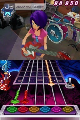 Copier sur le voisin, c’est bien. Y apporter sa touche, c’est encore mieux. Voilà le genre de conseils qu’on peut librement donner à Gameloft qui ne s’est pas vraiment tracassé la tête pour développer ce Guitar Rock Tour. De l’habillage au concept, en passant par le gameplay ou les petits détails qui font généralement la différence, le titre de Gameloft ne s’est pas gêné outre mesure pour piller les idées d’Activision et de Vicarious Visions, les développeurs de Guitar Hero : On Tour. Qu’à cela ne tienne, nos développeurs français ont décidé de se démarquer par la jouabilité au stylet. En effet, le Guitar Grip étant une invention brevetée par Activision, nul n’est autorisé à réutiliser l’accessoire qui retranscrit à merveille les sensations qu’on peut éprouver en jouant à Guitar Hero sur consoles. De ce fait, il va falloir se contenter du stylet dans Guitar Rock Tour pour se prendre pour un vrai rockeur nomade. Evidemment, le résultat n’est plus vraiment le même… En ce qui concerne la partie guitare, on retrouve bien les notes à valider à l’aide du stylet, mais rapidement, on se rend compte que le petite stylo a bien du mal à nous faire oublier le Guitar Grip. Le constat est encore plus alarmant pour la batterie, tout simplement injouable au stylet et sans intérêt lorsqu’il faut se saisir de la croix directionnelle et des touches pour valider les notes. Pire encore, on se rend compte que l’emplacement du Star Power sur la guitare et pour la batterie est mal choisi, ce qui nous empêche de profiter de nos bonus pour se concentrer sur les notes qui défilent. Si les premières parties peuvent se montrer amusantes au départ, très vite on se lasse de la jouabilité, même en mode "Difficile" où le challenge est un peu plus de taille. Cette indifférence quasi totale, on la doit aux placements des notes, mal fichus et c’est peu de le dire, aux reprises assez foireuses des morceaux choisis, mais aussi d’une playlist qui ne fera certainement pas l’unanimité. Orientée clairement pour les jeunes ados rebelles, elle ne fait pas le poids face aux épisodes de Guitar Hero : On Tour. C’est évidemment très subjectif mais on a encore du mal à se faire à l’idée qu’Avril Lavigne soit mis sur un même pied d’égalité que Deep Purple. Le prix à payer quand il faut viser le grand public, celui-là même qui écoute NRJ ou Fun Radio en boucle. Toujours est-il que Guitar Rock Tour pêche aussi du côté de sa réalisation, assez faiblarde soyons justes, même si ce n’est pas le point essentiel de ce genre de jeux. Le titre regorge de couleurs certes mais les développeurs ont fait preuve d’un tel mauvais goût qu’il est assez difficile de ne pas leur en vouloir. D’une ambiance censée être rock’n roll, on tombe dans un univers presque mielleux, limite bébé cadum, n’ayons pas peur des mots. Bref, un titre à oublier illico presto.