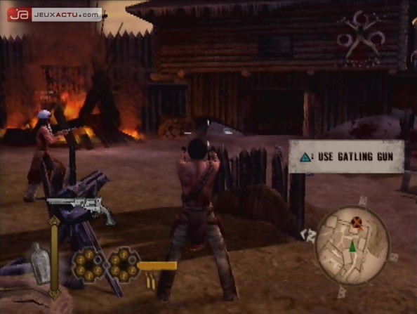 Pour le reste, c’est à pied que se déroulera le jeu puisqu’il est possible de pénétrer à l’intérieur de certains bâtiments pour discuter avec le tenancier d’un saloon ou bien encore de s'adresser au barman qui propose de temps à autre de faire quelques emplettes ou de s’informer sur d’éventuelles nouvelles qui circulent en ville. Ces personnages tiers sont visibles sur la boussole du jeu et sont indiquées par un point bleu, qui permet aussi de repérer des missions annexes comme cette fameuse séquence où il faut mener son troupeau de bovins d’un point A à un point B. Mais Gun fait également la part belle aux scènes d’action avec, vous l’imaginez, des gunfights comme on aime en voir dans les films de western. Si le jeu se déroule principalement en mode de vue à la troisième personne, il est possible de passer en vue subjective (R2). On passe alors en slow motion et l’action ralentit, permettant de tirer avec plus de précision. De même, pendant ce mode bullet time, une petite pression sur une direction permet de locker immédiatement un ennemi, ce qui permet au joueur de gagner du temps, chose précieuse sous le feu nourri de l’ennemi. Intuitif donc. Pas d’inquiétude à avoir cependant, Gun n’est pas un ersatz de Max Payne à la sauce Clint Eastwood, puisque le personnage Colton va évoluer au cours du jeu et de nombreuses missions optionnelles seront présentes pour booster ses caractéristiques. De plus, l’arsenal va s’améliorer au fil des missions pour atteindre la quarantaine d’armes upgradables disponibles, même si l’on peut uniquement porter un maximum de 4 armes et 2 types de grenades. Ce petit aspect RPG, couplé à la douzaine de changements d’aspect durant le jeu, concourt à faire de Gun un jeu à la variété évidente.