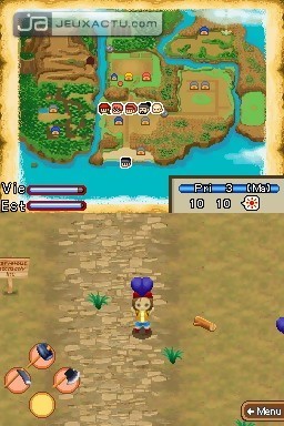 En ce qui concerne le concept, Harvest Moon DS : Ile Sereine ne fait donc pas dans l'original et reprend tout ce qui faisait le charme du précédent opus. Les fans apprécieront. Ils apprécieront aussi l'évolution graphique du soft, cette fois-ci totalement en 3D. Sommaire la 3D certes, mais tellement plus agréable que la simple copie de la version GBA qui nous avait été proposée la dernière fois ! En revanche, niveau interface, on regrettera fortement l'absence d'une carte nous montrant de manière simple et limpide où se trouve précisément notre personnage. En effet, la map étant loin d'être lisible, on se retrouve souvent perdu au milieu de nulle part à tourner en rond pour trouver l'entrée d'une maison, ce qui nous fait perdre ça et là quelques secondes. Quelques secondes, ce n'est pas grand chose, et ce défaut n'aurait pas été trop embêtant si la durée des journées dans le jeu n'était pas si courte. Car voilà bien un des gros points faibles du jeu ! Etant donné que les jours passent comme un éclair, la progression du joueur sera lente. Très lente. Pas le temps de casser deux cailloux, de sortir les poules et d'aller discuter avec le vendeur du village qu'il sera déjà l'heure d'aller se coucher. De quoi se lasser très vite, d'autant qu'avec l'endurance ridicule de votre personnage, il vous faudra très souvent aller faire le pleins de calories pour que ce dernier tienne debout (en remplissant régulièrement deux jauges, de vitalité et d'estomac). Et rien que ça, ça vous bouffera généralement le tiers d'une journée...