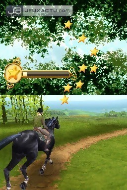 Contrairement à Alexandra Ledermann qui s’embourbe dans des scénarii grandiloquents et souvent bien vides au final, Horse Life mise sur la sobriété et le classicisme. Après avoir choisi le sexe de son avatar, nous voilà embarqués à la campagne où une visite chez le grand-père va révéler une passion soudaine : l’équitation. Il faut avouer que la mise à bas d’un poulain fut un choc émotionnel sans pareil si bien qu’après deux ans d’attente, le moment tant attendu de monter sur le dos de ce désormais jeune cheval, est un événement de taille. Tout comme le personnage principal, le joueur a le choix de son monture parmi trois races proposées (la licorne étant le cheval à débloquer) : Pur sang arabe, pur sang anglais et selle français. L’objectif de Horse Life étant de devenir un cavalier hors-pair, il va falloir se montrer à la hauteur pour accéder à un tel statut. Pour cela, respecter son animal est la première des conditions, et c’est là que Horse Life rejoint Nintendogs dans son principe. Dans le cadre des activités journalières, le joueur peut à tout moment accéder au pré, le havre de paix de notre ami chevalin où il est possible de le regarder gambader. C’est ici également qu’il va falloir gérer sa jauge d’humeur, un élément important pour qu’il puisse par la suite se rendre aux entraînements et autres compétitions sans le moindre stress. Quelques caresses, des friandises et beaucoup d’affection sont les mots d’ordre pour garder son cheval en bonne santé psychologique. De même, le toilettage de son cheval et le nettoyage du box dans lequel il séjourne sont des activités à remplir régulièrement pour qu’il ne déprime pas non plus.