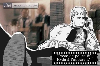 Hotel Dusk : Room 215 se situe à égale distance entre son prédécesseur spirituel (Another Code) et la référence du jeu à textes sur cette machine (Phoenix Wright), ce qui ne sous-entend nullement une absence de personnalité. Au contraire, puisque son graphisme est proprement unique, et son mode de progression aussi rigoureux que personnel. Hotel Dusk ne propose donc ni le côté aventure de Another Code, ni l’écriture surdouée de Phoenix Wright, mais recèle un certain nombre de qualités et trace son propre mode de pensée avec un talent éclairé. Primo, comme pour faire comprendre au joueur qu’il n’est pas dans un jeu vidéo ordinaire, Hotel Dusk propose (oblige, en vérité) de tenir la Nintendo DS comme un livre, optimisant la hauteur des deux écrans de la portable. Voici donc une fois de plus un jeu DS dans lequel aucun bouton ne sera nécessaire, et où toute action passe par des raccourcis sur l’écran tactile. Comme un livre, ou plutôt comme une bande dessinée, car telle est clairement l’effet recherché par les graphistes inspirés de Hotel Dusk : Room 215. Si les décors sont quelconques, voire mêmes assez laids lorsqu’ils sont modélisés en 3D sur l’écran de gauche, les protagonistes vivent à travers un trait noir et blanc racé, stylé, et animé d’un mouvement perpétuel qui le crédite d’un cachet hautement expressif ! C’est lorsque l’on comprend que le principal enjeu réside dans le dialogue, que l’intérêt du double écran prend son envol : l’un en face de l’autre, il permet d’observer pleinement et sans coupures les réactions des deux interlocuteurs.
