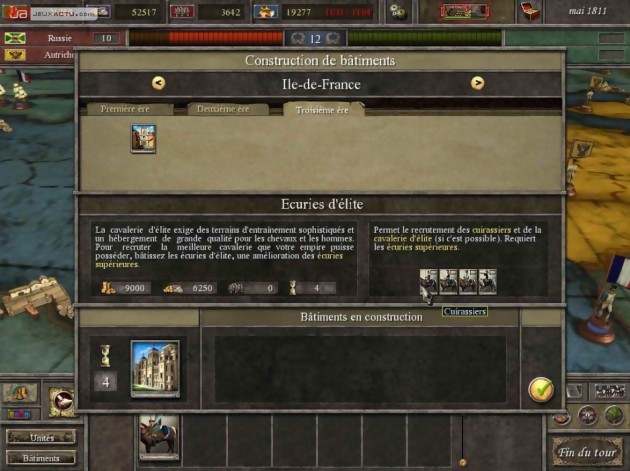 Avant de se lancer à corps perdu dans la bataille, l’initiation constituera un passage obligatoire pour maîtriser les différents aspects de la gestion économique ainsi que les batailles maritimes et terrestres. On y découvre ainsi une interface d’une grande simplicité, ce qui assure une prise en main immédiate et confortera les débutants. Par la suite, le mode "Campagne" vous proposera de réécrire l’Histoire aux commandes de la nation de votre choix parmi les grands empires de l’époque, dont la Grande-Bretagne, l’Autriche, la Prusse, la Russie et la France. Vous pouvez ainsi remporter la victoire par la conquête totale de l’Europe ou gagner aux points en assurant le score maximum à la fin du 480ème tour de jeu. Découpée en une multitude de provinces, la carte couvre toute l’Europe et les côtes méditerranéennes. Vous serez amené à faire face, bien sûr, à d’autres nations qui ne cacheront pas leurs ambitions expansionnistes mais qui ne sont, en revanche, pas jouables. Chaque province produit de manière variable un certain nombre de ressources (4 principales) que sont l’or, les matières premières, la nourriture et la population. Ainsi, certaines régions seront plus attractives que d’autres et les contrôler sera un atout non négligeable. Mais quoi qu’il en soit, chaque nation ne peut produire ses unités et son savoir scientifique qu’au travers de sa seule capitale, ce qui place d’emblée tout le monde sur un pied d’égalité. Pour annexer durablement un pays et faire main basse sur toutes ses conquêtes, il convient donc de faire le siège de sa même capitale durant une période proportionnelle aux forces engagées dans le conflit. Par la suite, mieux vaut