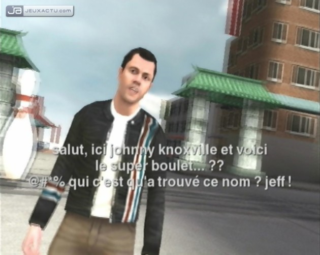 Bien sûr, en grands habitués de la série que vous êtes, vous savez que Johnny Knoxville et sa bande ne font pas seulement dans le douloureux. Il serait d’ailleurs réducteur de les assimiler uniquement à leurs jeux de souffrance. Heureusement pour les fans donc, toute la panoplie humoristique de ces timbrés a été reprise pour ce jeu déconseillé aux mineurs. Ici, leur caractère de sale gosse prêt à tout pour déranger leur monde côtoie le comique de situation, la scatophilie ou leurs simples délires entre potes. Comme sur MTV en somme. D’après le script du jeu, le réalisateur de la série se blesse sur le tournage de ce qui aurait dû être la nouvelle saison, et vous l’aurez sans doute compris, l’heureux héritier de cette noble tâche, c’est vous. Inutile de céder à la panique, il n’est pas ici question de jouer les Steven Spielberg et autre James Cameron en herbe. Non, on peut même dire que la pirouette scénaristique pour intégrer le joueur à la joyeuse troupe est complètement inutile, puisque c’est bien à l’aide de nos doigts affûtés, et non de notre œil avisé, qu’il faudra aider Steve-O et ses potes à remplir les “Souhaits Séquence Vidéo”, ou dans un français plus commun, les objectifs de tournage.