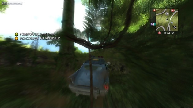 Dès lors qu’on opte pour la solution aérienne, on remarque les efforts des développeurs pour proposer des contrôles de véhicules différents. Si les engins à réaction ou à hélices se manient sans trop de problème pour peu qu’on ait le sens de l’orientation, le pilotage de deux roues et de bagnoles est un véritable calvaire doublé d’un supplice pour les oreilles. A l’image d’une tondeuse à gazon, les autos et les motos font un raffut d’enfer et en proposent la même conduite au sens où la moindre pression sur le stick analogique vous fait immédiatement zigzaguer. Il est très rare de réussir à maintenir une trajectoire droite que l’on soit à 200 km/h ou que l’on roule au pas. Ce gros problème de maniabilité nuit gravement à l’intérêt des bagnoles et une fois de plus on laissera tomber sa carte grise pour son permis bateaux, avions ou hélicoptères. Pour ces trois autres moyens de transports, presque rien ne vient perturber notre chevauchée fantastique… presque. Les développeurs de Just Cause nous proposent des phases de gameplay emprunt à Pursuit Force. C'est-à-dire que si vous avez l’âme d’un cascadeur, vous allez être servis ici. Sautez de véhicules en véhicules ou tentez le diable en plongeant d’un avion en plein vol, ça donne envie. Mais encore une fois le gameplay vient tout gâcher à cause d’une mauvaise configuration des boutons. Grosso modo, le Y permet d’entrer dans un véhicule et d’en sortir tandis que le A sert à s’accrocher à sa carlingue. Le B, quant est lui, est utile pour jumper sur un autre engin. Alors imaginez un instant que vous vous trompiez de touche et vous êtes bon pour vous rouler parterre laissant à l’abandon votre véhicule de croisière.