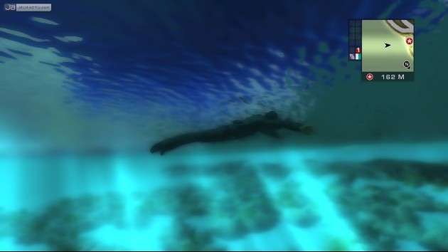 Lorsque vous planez au-dessus de San Esperito, Rico Rodriguez est toujours muni de son parachute de secours. Mais encore une fois, le plaisir de surplomber l’archipel se transforme en galère du fait de ne diriger qu’approximativement sa chute. Lente et monotone, on rangera rapidement son parachute pour piquer vers le sol la tête la première. La chute libre est vraiment très intéressante dans Just Cause mais si par malheur vous voulez dépliez votre parachute trop près de votre engin, vous allez en saisir la carrosserie et tomber irrémédiablement avec. Si à 300 mètres d’altitude, ce n’est pas grave, à 10 mètres du sol ça devient tout de suite plus problématique, et vous finirez comme une vieille crêpe séchée au soleil. Et puis dans ce florilège de cascades aériennes irréalisables mais tellement spectaculaires lorsqu’elles passent, il y a certains détails qui clochent comme le héros qui traversent les pales d’un hélicoptère sans se faire trancher façon chorizo ou un plongeon innocent de 3 kilomètres directement dans la mer qui ne réduit pas en bouillie notre Rico national.