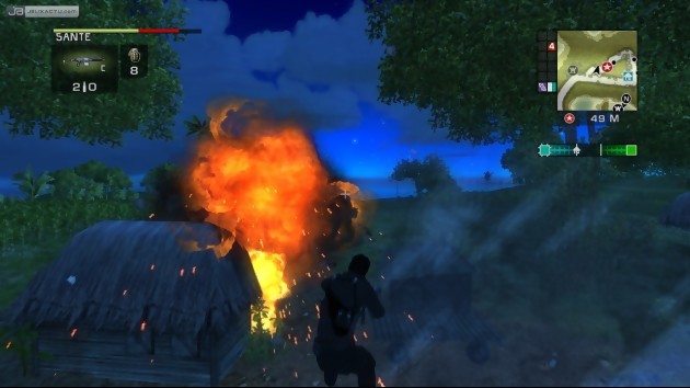 Vous aurez du pain sur la planche avant d’arriver à toucher la pointe du gouvernement car San Esperito n’est pas un de ces petites îles dont on fait le tour en quelques heures, Stilwater si tu nous entends. Avalanche Software nous propose pas moins de 1024 km² de surface exploitable sur terre, sur mer ou dans les airs. Premier point fort du soft, votre zone de jeu est identique par les chiffres à celle de Grand Theft Auto : San Andreas. Autrement dit, vous en aurez pour votre argent et la visite touristique de San Esperito vous en mettra plein les mirettes qu’il s’agisse de ses forêts verdoyantes, de ses plages paradisiaques, de son volcan majestueux ou de ses pueblos atypiques. L’archipel est très vaste et c’est d’autant plus important que vous pouvez voyager à votre guise avant, pendant ou après les missions que vous activerez afin de libérer le pays du joug de son dictateur. De ce fait, les développeurs ont pensé à intégrer un maximum de véhicules pour que vos promenades soient le plus diversifiées possible. Plus de 90 moyens de locomotion sont mis à votre disposition : mobylettes, scooters, bus, voitures, motos, 4x4, pick-up, jet skis, hélicoptères, tractopelles, bateaux, camions, avions… Une liste qui pourrait bien faire un paragraphe entier et c’est tant mieux car de cette façon, on n’en ressort pas frustré comme pour Saints Row.