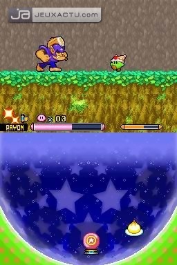 Les fans du premier opus DS peuvent aller se rhabiller. Ici, on n’oublie tous les acquis de 2005, et on reprend les bonnes recettes vieilles de plus d’une décennie. Kirby : Mouse Attack est ce qu’on peut appeler un retour aux sources. S'il est regrettable que les développeurs aient amorcé ce virage à 180 degrés, avouons néanmoins que malgré l’intermède Kirby : Le Pinceau du Pouvoir, ils ont entièrement gardé leur savoir-faire. Notre boule rose se révèle toujours aussi agréable à manier, ce qui est tout de même un élément fondamental dans un jeu de plates-formes. Le titre développé par HAL Laboratory est cependant d’un classicisme vraiment effrayant. Kirby, notre petit personnage tout rond tout rose a ici retrouvé ses membres, plus besoin donc de le guider à la pointe de notre stylet. Stylet d’ailleurs qu’on aura tôt fait de ranger dans l’emplacement prévu par la console. Si l’ami Kirby a retrouvé ses bras et ses jambes, il a aussi récupéré l’intégralité de sa force, celle qui a fait toute la renommée de la série et celle à la base de ce gameplay particulier, gober ses ennemis pour pouvoir profiter de leurs compétences. En plus des classiques pouvoirs élémentaires, on en trouvera d’autres beaucoup plus originaux voire insolites. Kirby pourra jouer au magicien, à Ryu de Street Fighter et même à l’elfe le plus connu du jeu vidéo, Link. Ajoutez à cela des pouvoirs qu’on obtient uniquement en fusionnant deux items, comme par exemple l’épée et le feu qui donne… l’épée de feu, et ce n’est pas loin d’une trentaine de choix qui s’offre à vous. Cette grande diversité n’influera malheureusement que très peu sur votre parcours, si certains types d’attaques sont plus efficaces en fonction des boss, vous vous en tirerez en général sans problème quelques soit le pouvoir utilisé. Reste que certaines compétences précises permettront de déclencher des mécanismes ou d’accéder à certains endroits. Soit.