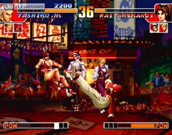 KOF '96 marquera l’histoire de la baston 2D à plus d’un titre. Non seulement, il fut le premier jeu de baston 2D à intégrer le run, avec toutes les subtilités qui vont avec, mais en plus a également fait évoluer le système de furies, désormais découpées en plusieurs niveaux et repris par la suite par le reste du monde. C’est une révolution à laquelle on assiste en 1996 dans le monde de la baston 2D. Déboussolés par ce nouveau gameplay, les joueurs sont donc obligés de reprendre les bases à zéro, d’autant que le timing demandé pour enchaîner les combos a lui aussi été modifié. La vitesse a été augmentée de 30% facile et la possibilité de passer dans le dos de l’ennemi (astuce reprise de Samurai Spirits III sorti en 1995) en exécutant une simple roulade, sans pour autant casser le rythme d’une course, se révèle être d’une efficacité monstrueuse. Un gameplay qui a donc posé les bases des KOF suivants, et qui à l’heure actuelle n’a pas perdu une once de son charme. Evidemment, les attaques, furies et autres combos font un peu tiep par rapport à un KOF 2002 mais le plaisir de jeu est resté intact, même sur PS2 où la conversation est plus que maîtrisée.