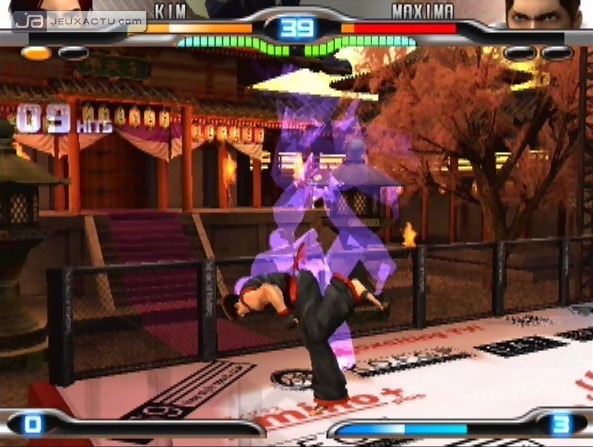 Visuellement, KOF : Maximum Impact 2 est donc raté, c’est ainsi. A l’instar de KOF : Maximum Impact, parvient-il à se rattraper grâce à son gameplay ? Dans l’absolu, oui puisque le jeu suit le même chemin emprunté par son aîné. En effet, ici, il va falloir enchaîner davantage les quarts de cercles et autres demi-cercles arrières pour sortir les coups spéciaux. Malgré des persos et un environnement en 3D, KOF : Maximum Impact 2 propose un gameplay proche d’un KOF classique en 2D, même si certaines nouveautés lui permet de se rapprocher un peu plus d’un Tekken, Soul Calibur ou Dead or Alive. En parlant du jeu de baston de Tecmo, certains aspects lui ont été empruntés par KOF : Maximum Impact 2, comme la possibilité d’annuler ou de contrer une attaque pour rendre la pareille. Pas si simple que ça à placer, compte-tenu de la vélocité des combats, ce nouvel élément perturbateur est sans nul doute la bonne (seule ?) surprise du jeu. S’il est toujours possible d’enchaîner les combats de la même manière qu’un KOF classique en 2D, d’autres techniques ont été ajoutées pour certains combos se rapprochent davantage d’un Tekken. Pas une mauvaise idée dans le fond puisque cela permet de varier les techniques lors d’un match un peu houleux. Restons dans les bonnes surprises avec une liste d’attaques et de coups spéciaux par personnage assez exhaustive. Chaque belligérant possède donc la globalité de leurs coups avec quelques inédits pour certains. Terry Bogard peut ainsi alterner entre le rising tacle, le power dunk, le burning knuckle, le power wave, le round wave et la fameuse glissade au sol qu’il avait récupéré dans Real Bout 2, sans oublier ces trois furies. De quoi satisfaire un public déjà bien lésé par la réalisation catastrophique de ce KOF : Maximum Impact 2.