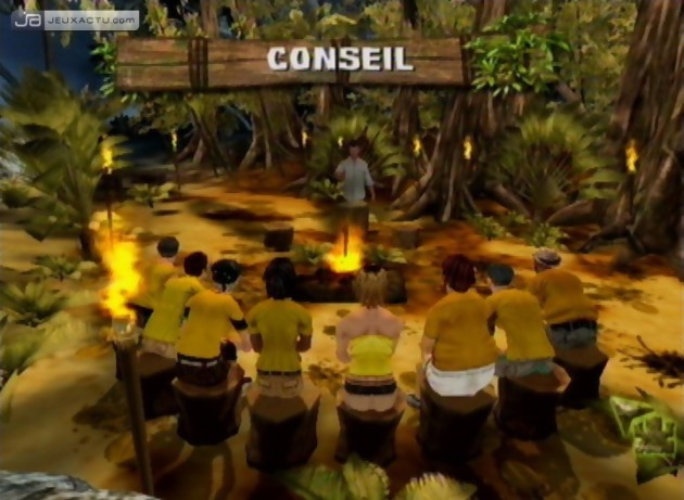 Clairement, non. Contrairement à ce que l’on aurait pu penser, Mindscape ne s’est pas laissé tenter par un Lost in Blue-like qui aurait sied à merveille avec le principe de l’émission. En lieu et place, nous avons droit à une sorte de party game qui nous demande d’enchaîner les épreuves de confort et d’immunité sans aucun lien ni aucune logique. Les premières sont censées nous conférer un avantage (nourriture, objet…) sur le jeu qui suit, bien que dans les faits, il est impossible de mesurer les apports d’une victoire. En revanche, perdre l’immunité sanctionne immédiatement notre équipe, un membre étant contraint de quitter l’aventure à l’issu d’un Conseil aux décisions obscures. En cas de succès, le jeu nous offre en revanche la possibilité d’éliminer un adversaire du camp adverse, tout en nous précisant la nature du challenge suivant, et les spécialités de chacun de nos opposants. De quoi nous offrir un petit avantage théorique un brin fourbe. Les 24 épreuves plus ou moins inspirées se suivent jusqu’à la fatidique épreuve des poteaux, sans aucune réunification, sans aucun candidat en souffrance contraint de quitter l’aventure, sans aucun accrochage verbal, ni même aucune famine à rassasier par une cuillère de riz pas cuit. Bref, sans l’essence même de Koh-Lanta. Pourtant la présence de Denis Brogniart en maître de cérémonie et de Christelle, la gagnante de la dernière édition, aurait pu apporter un semblant d’immersion bienvenu, mais en s’évertuant à modéliser le plus fidèlement du monde la poitrine de cette dernière, les développeurs en ont oublié l’essentiel : proposer une réalisation et un gameplay digne de ce nom. Le jeu laisse clairement un goût d’inachevé avec son moteur physique à deux francs six sous et sa prise en main trop perfectible pour être qualifier de réussie. Dans ces circonstances, difficile de trouver un semblant de fun. Si certains défis se relèvent sans trop de problème (tir et course, notamment), d’autres se montrent en revanche moins dociles comme les fouilles ou les phase en pirogue qui souffre davantage de ce manque incontestable de finition. Et même l’argument du Wii Balance Board ne pourra faire diversion.