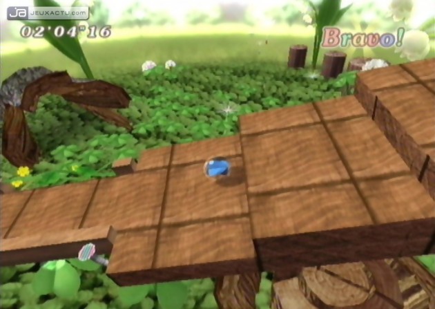 Les premiers pas se font en douceur bien évidemment, avec en premier lieu un seul et unique type de billes. Par la suite, d’autres billes de différentes formes (coccinelle, chat, chien, pingouin, ballon de foot, pastèque, cochon, panda etc.) et aux caractéristiques spécifiques se débloquent, tout comme les 50 niveaux dispersés en 5 univers distincts. Si l’objectif principal est de parvenir au point de rendez-vous sans la moindre chute, il faut également penser à récupérer les différents cristaux qui sont éparpillés sur le plateau. Il existe deux types de cristaux : ceux de couleur orange et les verts, bien plus compliqués à attraper certes mais facultatifs. A l’inverse les cristaux oranges doivent être impérativement récupérés afin de pouvoir activer la porte de sortie, sous peine de recommencer à nouveau le niveau. En inclinant le plateau, la balle se déplace sous l’effet de la gravité. Dextérité et stratégie sont donc les mots d’ordre pour diriger convenablement sa bille. Contrairement à un épisode de Super Monkey Ball, Kororinpa n’est pas limité en fonction du nombre de vie mais plutôt par le chronomètre. Plus le joueur met du temps à arriver à la sortie moins de chances il a de débloquer les quelques bonus du jeu. Billes supplémentaires, musiques inédites et nouveaux niveaux, voilà à peu près la (seule) carotte qui nous est proposée pour avancer presque aveuglément dans le jeu. Si l’insouciance des premières parties permet de s’amuser tranquillement, le joueur persistant se rendra rapidement compte que le choix de la bille s’avère être primordial pour ne pas trop galérer dans les labyrinthes. Mieux vaut par exemple choisir une bille à la rotation faible et donc plus lourde sur les plateaux glissants, afin d’éviter les chutes libres. Amusant au départ grâce à son concept rigolo, son ambiance écolo voire mignon et à une reconnaissance plutôt réussie de la Wiimote, Kororinpa s’essouffle rapidement au bout de deux à trois heures de jeu, la faute à une durée de vie limitée et à un manque flagrant de renouvellement. Il y a bien évidemment le mode à deux joueurs qui permet de s’affronter en écran splitté (à l’horizontale ou à la verticale) mais là aussi, l’amusement ne dure qu’un temps.