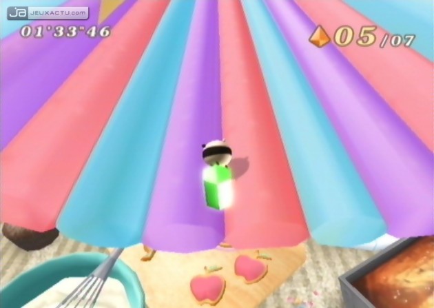 Les premiers pas se font en douceur bien évidemment, avec en premier lieu un seul et unique type de billes. Par la suite, d’autres billes de différentes formes (coccinelle, chat, chien, pingouin, ballon de foot, pastèque, cochon, panda etc.) et aux caractéristiques spécifiques se débloquent, tout comme les 50 niveaux dispersés en 5 univers distincts. Si l’objectif principal est de parvenir au point de rendez-vous sans la moindre chute, il faut également penser à récupérer les différents cristaux qui sont éparpillés sur le plateau. Il existe deux types de cristaux : ceux de couleur orange et les verts, bien plus compliqués à attraper certes mais facultatifs. A l’inverse les cristaux oranges doivent être impérativement récupérés afin de pouvoir activer la porte de sortie, sous peine de recommencer à nouveau le niveau. En inclinant le plateau, la balle se déplace sous l’effet de la gravité. Dextérité et stratégie sont donc les mots d’ordre pour diriger convenablement sa bille. Contrairement à un épisode de Super Monkey Ball, Kororinpa n’est pas limité en fonction du nombre de vie mais plutôt par le chronomètre. Plus le joueur met du temps à arriver à la sortie moins de chances il a de débloquer les quelques bonus du jeu. Billes supplémentaires, musiques inédites et nouveaux niveaux, voilà à peu près la (seule) carotte qui nous est proposée pour avancer presque aveuglément dans le jeu. Si l’insouciance des premières parties permet de s’amuser tranquillement, le joueur persistant se rendra rapidement compte que le choix de la bille s’avère être primordial pour ne pas trop galérer dans les labyrinthes. Mieux vaut par exemple choisir une bille à la rotation faible et donc plus lourde sur les plateaux glissants, afin d’éviter les chutes libres. Amusant au départ grâce à son concept rigolo, son ambiance écolo voire mignon et à une reconnaissance plutôt réussie de la Wiimote, Kororinpa s’essouffle rapidement au bout de deux à trois heures de jeu, la faute à une durée de vie limitée et à un manque flagrant de renouvellement. Il y a bien évidemment le mode à deux joueurs qui permet de s’affronter en écran splitté (à l’horizontale ou à la verticale) mais là aussi, l’amusement ne dure qu’un temps.
