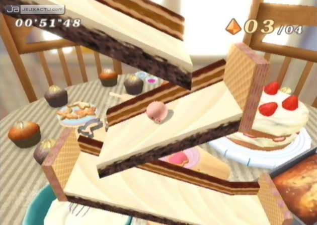 Les premiers pas se font en douceur bien évidemment, avec en premier lieu un seul et unique type de billes. Par la suite, d’autres billes de différentes formes (coccinelle, chat, chien, pingouin, ballon de foot, pastèque, cochon, panda etc.) et aux caractéristiques spécifiques se débloquent, tout comme les 50 niveaux dispersés en 5 univers distincts. Si l’objectif principal est de parvenir au point de rendez-vous sans la moindre chute, il faut également penser à récupérer les différents cristaux qui sont éparpillés sur le plateau. Il existe deux types de cristaux : ceux de couleur orange et les verts, bien plus compliqués à attraper certes mais facultatifs. A l’inverse les cristaux oranges doivent être impérativement récupérés afin de pouvoir activer la porte de sortie, sous peine de recommencer à nouveau le niveau. En inclinant le plateau, la balle se déplace sous l’effet de la gravité. Dextérité et stratégie sont donc les mots d’ordre pour diriger convenablement sa bille. Contrairement à un épisode de Super Monkey Ball, Kororinpa n’est pas limité en fonction du nombre de vie mais plutôt par le chronomètre. Plus le joueur met du temps à arriver à la sortie moins de chances il a de débloquer les quelques bonus du jeu. Billes supplémentaires, musiques inédites et nouveaux niveaux, voilà à peu près la (seule) carotte qui nous est proposée pour avancer presque aveuglément dans le jeu. Si l’insouciance des premières parties permet de s’amuser tranquillement, le joueur persistant se rendra rapidement compte que le choix de la bille s’avère être primordial pour ne pas trop galérer dans les labyrinthes. Mieux vaut par exemple choisir une bille à la rotation faible et donc plus lourde sur les plateaux glissants, afin d’éviter les chutes libres. Amusant au départ grâce à son concept rigolo, son ambiance écolo voire mignon et à une reconnaissance plutôt réussie de la Wiimote, Kororinpa s’essouffle rapidement au bout de deux à trois heures de jeu, la faute à une durée de vie limitée et à un manque flagrant de renouvellement. Il y a bien évidemment le mode à deux joueurs qui permet de s’affronter en écran splitté (à l’horizontale ou à la verticale) mais là aussi, l’amusement ne dure qu’un temps.