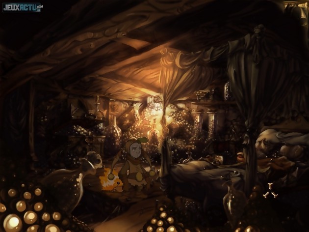 Les énigmes sont quant à elles tordues à souhait, parfois même un peu trop. La plupart du temps, des indices sont donnés dans les dialogues mais il arrive à deux ou trois reprises qu'on ne sache vraiment pas ce qu'on attend de nous. Dans ce cas, la fameuse méthode du "j'essaye tout et n'importe quoi" finit généralement par porter ses fruits et met en lumière, après-coup, le cheminement intellectuel que les développeurs pensaient nous faire suivre. Pour nous aider dans notre tâche, une fonction d'affichage des zones interactives de l'écran actuel est accessible via la barre d'espace. Plus que recommandé, son usage est carrément indispensable pour terminer l'aventure car les objets sont particulièrement bien intégrés au décor (a contrario des personnages, hélas) et certains n'occupent que quelques pixels de large. D'une manière générale, les errements qui attendent les novices, voire les joueurs confirmés pour certains casse-têtes quasiment introuvables, ne sont rien face au principal écueil du jeu, à savoir l'aspect technique. Passe encore que la résolution soit bloquée en 1024x768 ou que les scènes cinématiques rappellent les mauvais dessins animés des années 80. Il est en revanche plus regrettable que la lenteur de déplacement du héros rende certains allers et retours un poil trop fastidieux. De plus, les animations des différents personnages manquent singulièrement de souplesse et, au final, tout cela gâche un peu le plaisir que l'on a à découvrir les différents décors. Enfin, la version française possède son lot de défauts propres, à commencer par des voix nettement moins convaincantes que celles de la version originale. Pas de quoi briser totalement l'immersion, mais pas de quoi la renforcer non plus... L'aspect textuel n'est guère mieux loti, puisqu'on doit régulièrement se coltiner des coquilles, des erreurs d'orthographe, de grammaire ou de traduction. Si vous en avez l'occasion, procurez-vous donc de préférence une version anglaise, forcément affranchie de ces problèmes de localisation.