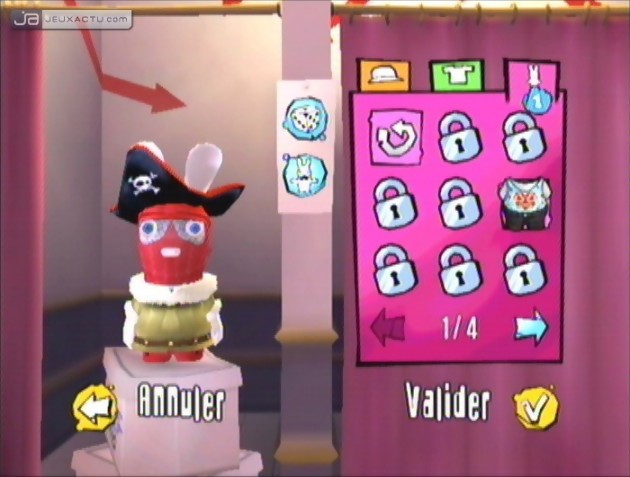 Les déceptions ne s’arrêtent pas là, étant donné qu’à notre plus grand surprise, Rayman contre Les Lapins ENCORE Plus Crétins se montre nettement moins beau graphiquement que son aîné. En plus de nous afficher des lapins aux oreilles angulaires, le jeu a le culot de nous balancer des textures dépourvus de détails et surtout d’une fadasserie affolante. L’argument de la Wii, console la moins puissante du marché, ne fonctionne pas ici, puisqu’elle est capable de nous offrir des jeux tels que Super Mario Galaxy ou bien encore Metroid Prime 3 : Corruption. Evidemment, comparons ce qui est comparable et dans le doute, nous avons ressorti le premier Rayman contre Les Lapins Crétins, et il ne fait aucun doute qu’il se montre plus brillant en matière de réalisation. Reste alors l’aspect personnalisation des personnages. Les amateurs de tuning peuvent désormais customiser Rayman et ses acolytes à poils doux de la tête aux pieds en leur enfilant également des combinaisons. Les possibilités sont nombreuses mais limitées, sans compter le retrait à la dernière minute des tenues parodiques des héros de Marvel, Star Wars ou bien encore Naruto, ce qui risque de décevoir les amateurs de super-héros. Décidément, le sort a décidé de s’acharner contre lui.
