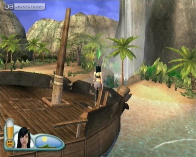 En septembre dernier, les petits êtres virtuels les plus célèbres du monde prolongeaient leur été en partant tardivement en vacances. Un peu moins de deux mois après l’ultime virée que fut Les Sims 2 : Bon Voyage, force est de constater que leur famille et leur employeur ne sont pas près de les revoir. C’est lors d’une petite sortie sur un yacht de nouveaux riches qu’ils furent pris dans une tempête les menant, vous vous en doutez, au naufrage. Séparés les uns des autres, ils vont devoir se retrouver pour former une tribu, s’accommoder à cette nouvelle façon de vivre et, pourquoi pas, tenter de mettre les voiles vers des horizons plus accueillants. Comme tout bon naufrage qui se respecte, c’est sur une plage déserte que votre avatar préalablement créé débutera son opération de survie. Le concept n’est pas nouveau, il est même à la mode - Lost, Koh Lanta entre autres -, et a pour prédécesseur vidéoludique les très frustrants Lost in Blue. Forcément, l’aventure ne peut que nous paraître familière, à la différence près que l’esprit des Sims apporte une certaine légèreté dans cet incident qui aurait dû être dramatique. Ici, la progression n’est pas fastidieuse pour un sou, tant le concept parvient à nous accrocher. Bien évidemment, il ne faudra pas s’attendre à disposer d’un nécessaire de survie, le sort nous ayant muni que d'un canif et d'une paillasse. L’occasion est donc parfaite pour les Sims de s’adonner à des joies dont ils étaient certainement peu coutumiers : cueillette, couture, bricolage, dressage de chimpanzés, etc. Les environs abondent de matières premières, la faim et le sommeil se font difficilement sentir, à condition de nourrir ses protégés, et de les mettre au repos régulièrement. Même en mangeant tout et n'importe quoi, une bonne gerbe suffira à ne pas rendre notre personnage malade. Bref, tout a été pensé pour que le joueur n’ait pas à s’arracher les cheveux, l’orientation grand public se faisant sentir à tous les niveaux. Inutile de jouer les faux élitistes donc. Le constat est similaire en ce qui concerne toute la partie technique. Les Sims 2 : Naufragés est moche, vieux, lent, avec des temps de chargement fréquents; mais qu’importe, le joueur se lançant dans l’aventure n’étant à priori ni une personne exigeante, ni une personne pressée. D’ailleurs, le jeu visant avant tout les amateurs de la série, Maxis et Electronic Arts ont bien veillé à offrir un très grand nombre de possibilités, histoire d’éviter le syndrome “changement de décor”. Le seul véritable reproche que l’on pourrait émettre ici, est le manque cruel de scénarisation qui nous fera vite tourner en rond. On se contente de vivre, point.