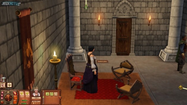 C'est décidé, voilà donc nos Sims plongés en plein Moyen-âge ! Les quartiers résidentiels typiquement américains ne sont évidemment plus de la partie, et c'est un véritable royaume qui s'offre à nous. En début de partie il est bien vide puisque seul le palais royal y est érigé. Par la suite, il vous appartiendra de bâtir un monastère, une caserne, un marché ou encore une tour de la sorcellerie grâce aux points de royaume gagnés au fil des quêtes. Mais avant cela, il convient de choisir un souverain parmi les personnages pré-configurés ou, mieux encore, d'en générer un tout nouveau tout beau grâce à l'option Créer un Sim. On retrouve alors un outil de création très proche de celui des Sims 3, la principale différence provenant du catalogue des vêtements disponibles. Dites adieu aux habits modernes, ainsi qu'au maquillage bizarrement, et bienvenue aux tenues d'époque. Ce qui ne risque pas de faire évoluer la réputation de "jeu pour petites filles" qui colle aux Sims, car les robes de princesse se taillent plus que jamais la part du lion. Une fois notre roi ou notre reine créé(e), on dispose d'un premier crédit de 1000 Simflouz à dépenser dans le mode Meubles. Une fois de plus, seuls des objets d'époque sont disponibles, ce qui restreint beaucoup les possibilités par rapport à un épisode standard des Sims. Autre changement très important, on ne préside plus du tout à la destinée d'une ou plusieurs familles de Sims. Nos héros ne vieillissent pas, et la plupart des quêtes peuvent être résolues en ne contrôlant qu'un seul personnage à la fois. Et en tout, seuls dix héros différents peuvent être créés, chacun correspondant à un poste bien précis du royaume. Nous avons donc le souverain, le chevalier, le marchand, le barde, le prêtre jacoban, le prêtre pétérien, l'espion, le sorcier, le médecin et le forgeron. Selon les quêtes qu'on choisira de remplir par la suite, on contrôlera donc l'un ou l'autre de ces personnages, sachant que la résolution de certaines missions différera sensiblement selon le protagoniste retenu. Un barde ou un chevalier ne procéderont par exemple pas de la même manière pour étouffer une révolte de paysans.
