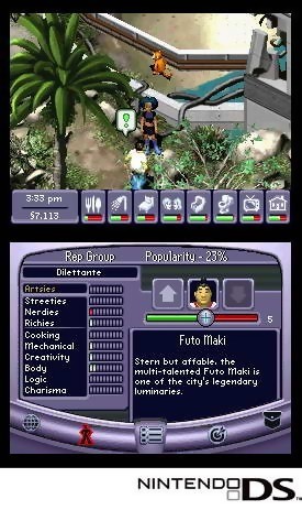Chaque personnage côtoyé vous donnera différents objectifs à remplir (cumuler une certaine somme d’argent, apporter un objet précis, ou se créer des affinités avec un autre Urbz), et c’est entre deux actions quotidiennes qu’il faudra prendre le temps d’accomplir ces actions. En effet, le fameux Métro-Boulot-Dodo est plus que présent, et chaque jour vous serez confronté à la même rengaine : un tour au trône, un autre sous la douche, on mange, on tente de gagner quelques Simoleons (la monnaie du jeu), on discute avec les gens pour combler la jauge de sociabilité, et avant d’aller se reposer il vous reste quelques instants pour penser aux objectifs. Une fois certaines missions remplies, vous débloquerez des mini-jeux vous permettant de gagner plus rapidement de l’argent, mais une fois de plus il faut bien souvent oublier le stylet, et surtout les jeux deviendront vite lassants car on aura tendance à en sur-consommer pour avancer plus vite, et ainsi pouvoir payer ses factures.