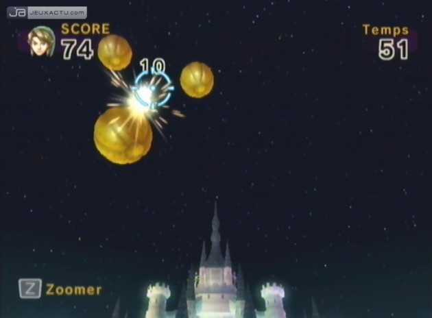 A l'instar du combo bleeding de The Club, un multiplicateur reprend le nombre d'ennemis abattus successivement. Plus docile que le titre de Bizarre Creations, et nettement moins hardcore, Link's Crossbow Training ne contraint pas le joueur à aligner les frags à la vitesse de la lumière, puisque le coefficient est conservé jusqu'à la prochaine cible éliminée, sans limite de temps. La précision est donc de mise, et même s'il est difficile de parler de headshot ici, le jeu récompense les joueurs qui font preuve d'une acuité visuelle extrême en leur accordant plus de points. On dispose d'autres moyens pour claquer le high score, comme viser en priorité les cibles dorées, ou bien mitrailler certains éléments destructibles du décor - vases, rupees, épouvantails - omniprésents, quelle que soit la mission. Il en existe d'ailleurs trois types : le tir sur cibles, la défense, et l'assaut. Le tir sur cible est on ne peut plus basique, puisqu'il s'agit de tirer sur les panneaux de bois qui apparaissent successivement à l'écran. Pour tromper le joueur, certaines cibles fictives - croix bleue ou autres - viennent se faufiler dans l’espoir de faire perdre des points. La mission défense présente un tout autre challenge, puisqu’il faut cette fois protéger sa carotide des crocs ennemis, un radar en bas de l’écran permettent de mieux les visualiser. Ici, on ne se déplace pas, et seules les cervicales travaillent. En tirant sur un ennemi entouré d'un halo vert lumineux, on peut même profiter d'une arbalète-mitraillette qui permet d'abattre un tas de monstres de façon plus efficace. Dans cette configuration, les munitions sont bien évidemment comptées, et la cadence normale revient au bout de quelques secondes. Enfin, l'assaut permet de se déplacer dans des zones de taille restreinte, mais dans lesquelles on peut avoir du mal à situer quelques sbires, même avec le radar. C'est aussi l'occasion de profiter du zoom, plutôt discret jusqu'à présent, et qui s’avère rapidement indispensable pour flinguer les Moblins perchés en haut des tours.