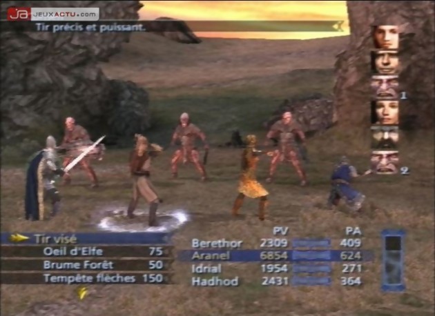 Le point de départ du Tiers Age se situe à l’époque de La communauté de l’anneau et aux prémices donc de l’affrontement épique entre les sbires de Saroumane et les potes de Gandalf. Après une intro en vidéo, nous voilà donc prêt à aller croiser le fer avec de l’orque ou de l’ourouk mais une première déception pointe immédiatement le bout de son nez : on n’incarne pas un héros du livre/film mais Berethor, un obscur garde de la citadelle du Gondor ! Et pourquoi pas le comptable de Hobbitbourg ou l’aubergiste du Poney Fringant… D’emblée, on se contrefiche de ce qui va donc pouvoir arriver à notre héros tout comme à ceux qui vont l’accompagner au fil de ses rencontres : Idrial de la Lothlorien, Elegost des Dunedain (un ersatz d’Aragorn), Hadhod (une caricature de nain), Morwen du Penmark et enfin, Eaoden du Riddermark. Nul besoin de signaler que chacun d’entre eux a ses propres spécificités comme dans tout jeu de rôle qui se respecte. A la manière d’un Final Fantasy VII, par exemple, vous ne contrôlerez, lors de la plupart des combats, que trois de vos personnages à choisir parmi les six disponibles. Tout comme dans FF7, d’ailleurs, une jauge, une fois remplie, vous permettra de déclencher un super coup. Seule différence, cette jauge augmentera en fonction des coups que vous porterez et non de ceux que vous prendrez et ce, de manière groupée et non individuelle comme dans le hit de Square. Tant qu’on est dans l’univers FF, restons-y puisque Le Tiers Age propose également un système de combats aléatoires sur les cartes que vous traversez. Tant qu’à s’inspirer (copier ?), autant le faire à partir des références du genre, me direz-vous. Mouais, vous rétorquerai-je d’une moue désabusée, c’est surtout là que s’arrête la ressemblance avec le mythique Final Fantasy VII. On ferme le ban et on passe à un autre paragraphe.