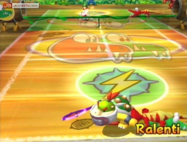 Ces Special Shots sont une énième occasion pour Nintendo de mettre en scène ses mascottes dans des situations plus ou moins comiques. Pour se défendre des attaques ennemies, Waluigi se bouche les oreilles et se met à nager dans une piscine fictive qui couvre toute sa surface, pour renvoyer la balle de l'autre coté du filet. Donkey Kong, lui, se permet de lancer une banane géante pour rattraper au vol un coup un peu trop éloigné de son énorme carcasse. Par contre, là où la chose est moins drôle c'est de constater que les super-attaques défensives permettent de rattraper tous les coups. Oui, tous les coups ! Si vous envoyez un coup droit en Turquie alors que votre pote partait en direction de Madrid, il réussira tout de même à vous renvoyer la balle comme s'il était à Istanbul. Frustrant, non ? Et ça l'est d'autant plus lorsque les points deviennent de plus en plus difficiles à remporter, notamment lorsque l'on affronte le CPU pour venir à bout des différentes coupes. Non pas que l'I.A. soit insurmontable comme certains ont pu le laisser entendre, mais force est de constater que certains retournements de situation sont difficilement supportables. Par ailleurs, à chaque fois que l'on exécute un coup-qui-tue-tout-sa-race, on a droit à une jolie séquence animée qui a le mérite de casser le rythme du jeu. Pas très malin ça, messieurs. Au final, on ne sait pas trop où la balle va atterrir, et on s'en remet un peu (beaucoup même) à la providence. Avec les Special Shots, Nintendo aurait du jouer la carte de la rareté car ces coups spéciaux se banalisent assez rapidement. Pour encore mieux privilégier la technique au bourrinage, il aurait été préférable de faire en sorte qu'un mouvement spécial offensif et défensif ne soit utilisable qu'une fois par jeu. Cela aurait évité la multiplication des one man show à l'écran. Les tricheurs n'auraient également pas été tentés de sélectionner leur personnage uniquement parce que ses supers-pouvoirs sont très avantageux. Sans citer de noms pour ne froisser aucune star du casting de Mario Power Tennis, il faut reconnaître que certains supers sayajin sont plus supers que d'autres.