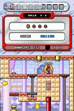 Cela dit, Mario Vs. Donkey Kong 2 est un jeu ultra-accessible, même pour les mononeurones. La faute à un niveau de difficulté mal ajusté qui donne accès au stage suivant dès lors qu'un mini-Mario atteint la sortie. Même constat pour les affrontements contre Donkey Kong venant ponctuer les dernières marches de chaque étage. A l'aide d'un canon et d'un mini-Mario faisant office de boulet, on doit flinguer le bougre tout en esquivant les gravats qu'il peut balancer. Pour trouver dans le jeu ne serait-ce qu'un peu de challenge, il faut alors prendre le soin de respecter certains critères qui permettent d'engranger un maximum de points. L'idéal serait donc de terminer le niveau d'une traite, sans s'arrêter et en ramassant toutes les pièces. Des points bonus sont également accordés si on fait sortir les mini-Mario en file indienne, tout ça dans l'espoir d'obtenir une étoile d'or, d'argent ou de bronze, passeports indispensables pour accéder à des trésors cachés du jeu. Sont aussi éparpillées sur un même étage neuf cartes qui, une fois regroupées, composent le terme "MINIMARIO", ce qui débloque un mini-game basique dans lequel on doit frapper des Maskass avec le stylet. Pas vraiment de quoi sauter au plafond. Par contre, on appréciera la possibilité de créer ses propres niveaux grâce au mode Construction. On dispose alors d'éléments tirés des différents mondes terminés; mais apparemment il n'est pas possible de croiser les genres. Une fois la toile terminée, on peut la diffuser sur le réseau via le online, ou bien l'envoyer tout simplement au voisin, pour peu qu'il ait une DS et une copie du jeu.