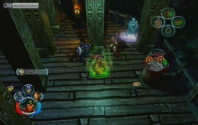Cette facilité de progression est peut-être un peu trop présente même pendant les combats. Pas besoin d’utiliser de fioles magiques ou de breuvages médicaux, les orbes rouges que vous récupèrerez en tuant vos ennemis rempliront aisément votre jauge de vie. Parfois même certains personnages comme Doctor Strange se régénèreront au contact des vilains. Il est donc rare de mourir, mais pas impossible. Si votre avatar s’écroule au sol, il vous reste trois autres collègues à utiliser car vous pouvez les choisir quand vous voulez et comme vous voulez via la croix multidirectionnelle. Mais en règle générale, ce sont les personnages dirigés par l’intelligence artificielle qui meurent les premiers tout simplement parce qu’ils ne sont pas très fût-fûtes lorsque vous vous approchez des ravins ou d’une rivière de lave. Malgré le bouton RT qui permet de leur donner des ordres dont celui de vous suivre, d’attaquer ou de défendre, ils n’hésitent pas à poursuivre un adversaire même lorsqu’il périt dans les flammes. Autant dire que pour palier à ce problème, le mode "Coopération" vous tend les bras. Jouables jusqu’à quatre sur une seule console ou sur Xbox Live malgré quelques problèmes de lag, ce mode double considérablement la durée de vie du jeu. Comptez une dizaine d’heures de jeu en solo sans vous occuper des nombreuses missions annexes caractérisées par des disques de simulation d’entraînement pour terminer Marvel Ultimate Alliance.