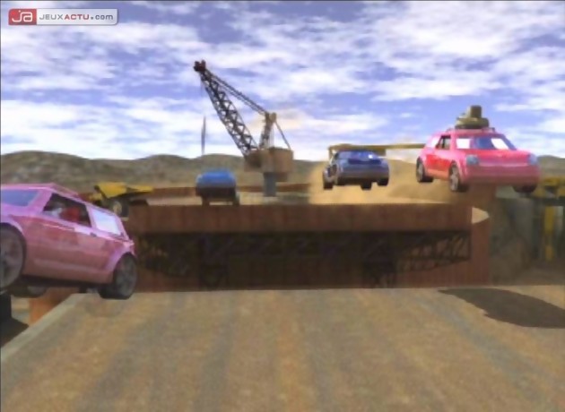 Mis à part les épreuves vous demandant de finir une course sans vous faire éjecter par les autres ou dans un temps limité entre chaque checkpoint sous peine de voir votre voiture exploser, Mashed Fully Loaded vous demandera surtout de cumuler les points. Les courses dépassant rarement la minute, il vous faudra prouver que votre victoire n’était pas un hasard et donc reproduire celle-ci un certain nombre de fois. Mais si chaque pole position vous gratifie d’un point ou deux, un mauvais classement peut tout aussi vite vous faire retomber et donc créer un nombre de manches successives parfois incalculable. Le mode solo présente donc alors par moment une certaine forme de répétitivité et nous condamne à appeler les potes pour jouer en multijoueur. Si les remarques et insultes gentillettes ne manqueront pas dans le feu de l’action, les propos de vos amis ne pourront que dépasser ceux de l’IA du jeu (avec un « va te faire regarder » particulièrement affligeant), et surtout vous pourrez y répondre, aussi bien verbalement que concrètement dans le jeu. Grande absente du mode solo, l’attaque aérienne va en effet vous permettre de venger votre éviction du terrain ou encore de choisir qui sera le prochain à sortir de piste pour rééquilibrer le tableau des scores. Attention aux alliances.