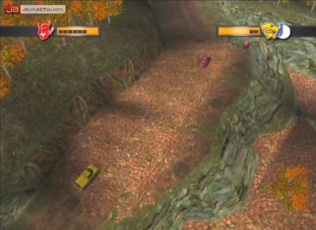 Mis à part les épreuves vous demandant de finir une course sans vous faire éjecter par les autres ou dans un temps limité entre chaque checkpoint sous peine de voir votre voiture exploser, Mashed Fully Loaded vous demandera surtout de cumuler les points. Les courses dépassant rarement la minute, il vous faudra prouver que votre victoire n’était pas un hasard et donc reproduire celle-ci un certain nombre de fois. Mais si chaque pole position vous gratifie d’un point ou deux, un mauvais classement peut tout aussi vite vous faire retomber et donc créer un nombre de manches successives parfois incalculable. Le mode solo présente donc alors par moment une certaine forme de répétitivité et nous condamne à appeler les potes pour jouer en multijoueur. Si les remarques et insultes gentillettes ne manqueront pas dans le feu de l’action, les propos de vos amis ne pourront que dépasser ceux de l’IA du jeu (avec un « va te faire regarder » particulièrement affligeant), et surtout vous pourrez y répondre, aussi bien verbalement que concrètement dans le jeu. Grande absente du mode solo, l’attaque aérienne va en effet vous permettre de venger votre éviction du terrain ou encore de choisir qui sera le prochain à sortir de piste pour rééquilibrer le tableau des scores. Attention aux alliances.