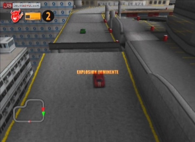 Mis à part les épreuves vous demandant de finir une course sans vous faire éjecter par les autres ou dans un temps limité entre chaque checkpoint sous peine de voir votre voiture exploser, Mashed Fully Loaded vous demandera surtout de cumuler les points. Les courses dépassant rarement la minute, il vous faudra prouver que votre victoire n’était pas un hasard et donc reproduire celle-ci un certain nombre de fois. Mais si chaque pole position vous gratifie d’un point ou deux, un mauvais classement peut tout aussi vite vous faire retomber et donc créer un nombre de manches successives parfois incalculable. Le mode solo présente donc alors par moment une certaine forme de répétitivité et nous condamne à appeler les potes pour jouer en multijoueur. Si les remarques et insultes gentillettes ne manqueront pas dans le feu de l’action, les propos de vos amis ne pourront que dépasser ceux de l’IA du jeu (avec un « va te faire regarder » particulièrement affligeant), et surtout vous pourrez y répondre, aussi bien verbalement que concrètement dans le jeu. Grande absente du mode solo, l’attaque aérienne va en effet vous permettre de venger votre éviction du terrain ou encore de choisir qui sera le prochain à sortir de piste pour rééquilibrer le tableau des scores. Attention aux alliances.