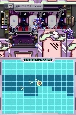 On parlait de réaction de la part de Capcom, mais ne soyez pas dupe, que serait un Megaman sans une progression savamment orchestrée ? Elément clé qui a servi à la renommée du gameplay de la série, l’acquisition de nouvelles compétences se place encore en point central de notre avancée dans le jeu. Dans Megaman ZX, Vent et Aile récupéreront de nouveaux Biometals à chaque boss éliminé, et à la manière des anciens épisodes de la série, les capacités que confèrent les nouvelles armures se feront le point faible d’un futur adversaire. Ici, les Biometals récupérés seront à combiner à celui de base, le Biometal X, pour débloquer les mouvements spéciaux de nos héros. Ces nouvelles combinaisons seront alors l’occasion de profiter, faiblement certes, des capacités de la DS au travers de diverses informations (vie restante d’un ennemi, plan détaillé des environs…) s’affichant sur le second écran par exemple. La partie tactile du titre ne servira qu’à un seul Biometal, et pour définir la trajectoire de vos missiles. En ce qui concerne le gameplay, peu de choses ont bougé depuis vingt ans. Tirer droit devant vous est la seule option proposée, impossible de s’accroupir pour éviter les attaques ennemies, bref la raideur légendaire des Megaman nous fait encore une fois honneur de sa présence. Cependant, ce dernier mouvement est désormais possible et il faudra se séparer de tout Biometal pour y parvenir. En forme humaine, des passages étroits s’ouvriront alors à vous pour poursuivre votre exploration, et c’est aussi sous cette forme qu’il sera conseillé d’aborder les honnêtes citoyens pour leur éviter tout choc émotionnel. Les boss, pas forcément durs à battre, vous demanderont encore une fois une analyse de leurs mouvements et attaques pour pouvoir se faire contrer efficacement, une méthodologie à l’ancienne donc, qui pourra poser quelques difficultés aux non avertis.
