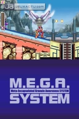 On parlait de réaction de la part de Capcom, mais ne soyez pas dupe, que serait un Megaman sans une progression savamment orchestrée ? Elément clé qui a servi à la renommée du gameplay de la série, l’acquisition de nouvelles compétences se place encore en point central de notre avancée dans le jeu. Dans Megaman ZX, Vent et Aile récupéreront de nouveaux Biometals à chaque boss éliminé, et à la manière des anciens épisodes de la série, les capacités que confèrent les nouvelles armures se feront le point faible d’un futur adversaire. Ici, les Biometals récupérés seront à combiner à celui de base, le Biometal X, pour débloquer les mouvements spéciaux de nos héros. Ces nouvelles combinaisons seront alors l’occasion de profiter, faiblement certes, des capacités de la DS au travers de diverses informations (vie restante d’un ennemi, plan détaillé des environs…) s’affichant sur le second écran par exemple. La partie tactile du titre ne servira qu’à un seul Biometal, et pour définir la trajectoire de vos missiles. En ce qui concerne le gameplay, peu de choses ont bougé depuis vingt ans. Tirer droit devant vous est la seule option proposée, impossible de s’accroupir pour éviter les attaques ennemies, bref la raideur légendaire des Megaman nous fait encore une fois honneur de sa présence. Cependant, ce dernier mouvement est désormais possible et il faudra se séparer de tout Biometal pour y parvenir. En forme humaine, des passages étroits s’ouvriront alors à vous pour poursuivre votre exploration, et c’est aussi sous cette forme qu’il sera conseillé d’aborder les honnêtes citoyens pour leur éviter tout choc émotionnel. Les boss, pas forcément durs à battre, vous demanderont encore une fois une analyse de leurs mouvements et attaques pour pouvoir se faire contrer efficacement, une méthodologie à l’ancienne donc, qui pourra poser quelques difficultés aux non avertis.