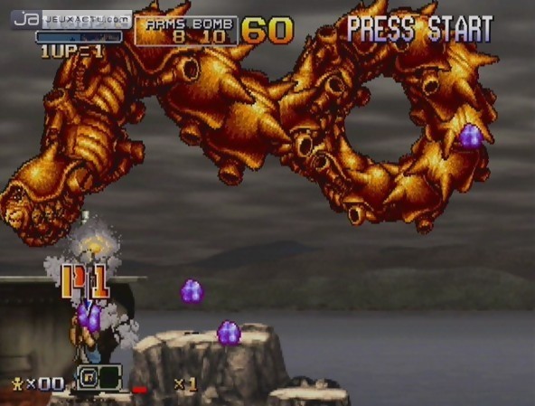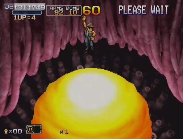 Côté gameplay, les nouveautés sont également au rendez-vous puisqu’il est désormais possible de cumuler jusqu’à deux types d’armes différentes. Fini donc les moments de frustration lorsque son shot gun laissait subitement la place à un vulgaire drop shot. En appuyant sur la touche "Rond", le joueur peut passer d’une arme à une autre, afin de profiter des avantages de chacune d’entre elles. Les joueurs les plus pertinents ne manqueront pas de remarquer que les munitions ont considérablement diminué globalement et pour l’ensemble des personnages, obligeant ainsi le joueur à surveiller de près sa réserve de balles qu’il devra utiliser à bon escient pour ne pas se retrouver avec un simple revolver en face d’un boss. Metal Slug 6 plus technique ? Pas vraiment. Plus tactique ? Assurément. Mais dans l’absolu, le titre reste un défouloir de première catégorie dont la durée de vie n’excède malheureusement pas les trois heures de jeu, la faute aux continues illimités. C’est donc une formule toute crachée que continue de suivre SNK Playmore. Une recette qui fonctionne à merveille sur Arcade mais se révèle être un peu limitée sur consoles de salon. Fort heureusement, Metal Slug 6 n’est vendu au Japon qu’à environ 4 200 yens au Japon, soit une petite trentaine d’euros, ce qui devrait convenir largement à la bourse des fans de la première heure.