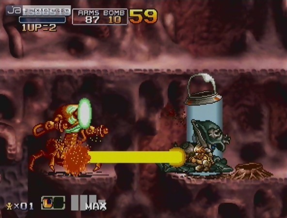 Plus inspirée que Metal Slug 4 et Metal Slug 5, l’histoire de Metal Slug 6 nous permet de découvrir une nouvelle race extra-terrestre, plus féroce que les Mars people qu’on commence à connaître par cœur et avec lesquels nos soldats vont unir leurs forces pour se débarrasser de ces nouveaux parasites. Si les déplacements des héros dans Metal Slug 6 restent un exemple de précision, on reste assez déçu quant aux design des différents boss du jeu qui manquent singulièrement d’inspiration, avec un robot patineur qui flaire le déjà-vu à plein nez. Dommage également que les chemins multiples n’ont pas été conservés, élément pourtant novateur de Metal Slug 3 et qui permettait de recommencer plusieurs fois le jeu avant de découvrir l’ensemble des tracés proposés. Il ne reste donc plus qu’à attendre une fois encore l’arrivée d’un épisode regroupant l’ensemble de ces qualités, doté si possible d’une durée de vie approchant la dizaine d’heures et le contrat sera alors rempli. Mais avoir le beurre et l’argent du beurre ne semble pas être une formule adaptée dans le jeu vidéo, ou alors que trop rarement.