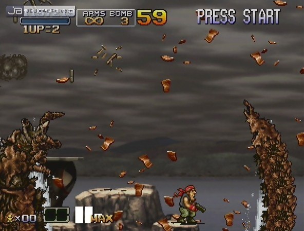 Côté gameplay, les nouveautés sont également au rendez-vous puisqu’il est désormais possible de cumuler jusqu’à deux types d’armes différentes. Fini donc les moments de frustration lorsque son shot gun laissait subitement la place à un vulgaire drop shot. En appuyant sur la touche "Rond", le joueur peut passer d’une arme à une autre, afin de profiter des avantages de chacune d’entre elles. Les joueurs les plus pertinents ne manqueront pas de remarquer que les munitions ont considérablement diminué globalement et pour l’ensemble des personnages, obligeant ainsi le joueur à surveiller de près sa réserve de balles qu’il devra utiliser à bon escient pour ne pas se retrouver avec un simple revolver en face d’un boss. Metal Slug 6 plus technique ? Pas vraiment. Plus tactique ? Assurément. Mais dans l’absolu, le titre reste un défouloir de première catégorie dont la durée de vie n’excède malheureusement pas les trois heures de jeu, la faute aux continues illimités. C’est donc une formule toute crachée que continue de suivre SNK Playmore. Une recette qui fonctionne à merveille sur Arcade mais se révèle être un peu limitée sur consoles de salon. Fort heureusement, Metal Slug 6 n’est vendu au Japon qu’à environ 4 200 yens au Japon, soit une petite trentaine d’euros, ce qui devrait convenir largement à la bourse des fans de la première heure.