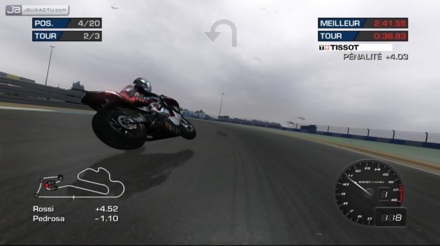 Conformément à la réalité, il faudra participer aux 16 épreuves qui composent le championnat du monde pour espérer décrocher le titre suprême. On se dirige naturellement vers les essais pour faire connaissance avec le parcours en faisant quelques tours de piste et en on profite pour fignoler les derniers réglages de votre machine. Une manœuvre pas si compliquée que cela dans la mesure où il n’y a qu’une dizaine de paramètres possibles et qu’ils sont relativement accessibles à tous. Etape suivante : les qualifications. Assez peu orthodoxe là non plus dans l’approche puisque vous disposez d’un capital temps de 10 minutes pour faire vos quelques tours de pistes. Départ arrêté depuis le stand – vous pourrez choisir de repartir depuis ce lieu à n’importe quel moment – et chaque sortie de piste, ne serait-ce que mordiller le bord, sera doublement sanctionnée. Déjà par le fait de l’acte en lui-même qui va considérablement augmenter votre chrono mais auquel s’ajoutera également des pénalités de temps au moins égale au délai nécessaire pour revenir sur le bitume. Mieux vaudra donc soigner chacun de ses virages et prendre correctement la corde, quitte à freiner plus que de raison pour éviter le moindre risque.