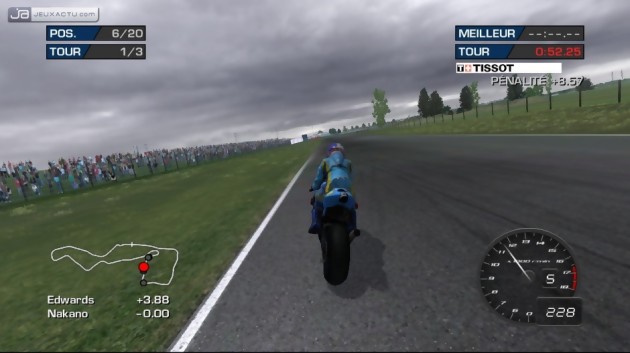 Conformément à la réalité, il faudra participer aux 16 épreuves qui composent le championnat du monde pour espérer décrocher le titre suprême. On se dirige naturellement vers les essais pour faire connaissance avec le parcours en faisant quelques tours de piste et en on profite pour fignoler les derniers réglages de votre machine. Une manœuvre pas si compliquée que cela dans la mesure où il n’y a qu’une dizaine de paramètres possibles et qu’ils sont relativement accessibles à tous. Etape suivante : les qualifications. Assez peu orthodoxe là non plus dans l’approche puisque vous disposez d’un capital temps de 10 minutes pour faire vos quelques tours de pistes. Départ arrêté depuis le stand – vous pourrez choisir de repartir depuis ce lieu à n’importe quel moment – et chaque sortie de piste, ne serait-ce que mordiller le bord, sera doublement sanctionnée. Déjà par le fait de l’acte en lui-même qui va considérablement augmenter votre chrono mais auquel s’ajoutera également des pénalités de temps au moins égale au délai nécessaire pour revenir sur le bitume. Mieux vaudra donc soigner chacun de ses virages et prendre correctement la corde, quitte à freiner plus que de raison pour éviter le moindre risque.