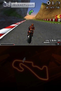Hélas, on ne pourra pas faire traîner le suspense bien longtemps puisqu’une vidéo de gameplay du jeu a été dévoilée en mai dernier. Quelques images qui suffisent à se faire une idée sur la nature réelle de ce jeu de moto. Les fans peuvent donc se rassurer, dans Moto Racer DS, il vous faudra toujours - et plus que jamais - pousser des bolides infernaux dans des courses à 200 km/h qui feront allégrement mentir les principes fondamentaux de la dynamique de translation dictées par Newton dans ses fameuses lois. Ici, rien à secouer des lois de la physique élémentaire, étant donné que c'est la vitesse qui prime sur tout le reste, avec comme seuls mots d'ordre le fun et le plaisir. De l'Arcade pur et dur donc, dans la digne tradition du titre et comme si traverser des chicanes en épingle à cheveux à toute berzingue ne suffisait pas, le jeu intègre également un boost qui permet de faire cracher son pot d’échappement.