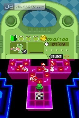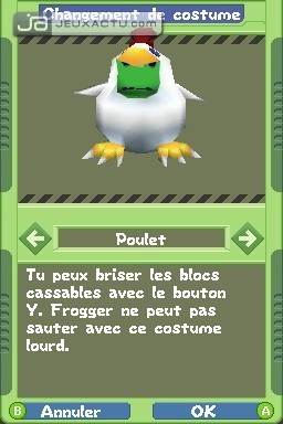 Impossible de passer à côté du phénomène Frogger que vous soyez un gamer de la première heure ou un novice dans le domaine. La petite bouille verdâtre de la grenouille s’est illustrée au fil des ans sur de multiples plates-formes et à de rares exceptions près, son principe n’a pas changé d’un iota. Et c’est à peu près ce qu’a voulu conserver Konami en développant My Frogger Toy Trials sur DS. C’est avec cette appellation des plus joviales que l’éditeur tente de sensibiliser les plus jeunes aux mésaventures de la grenouille la plus célèbre du jeu vidéo. Oubliez les autoroutes surchargées et les rivières infestées de crocodiles, My Frogger Toy Trials vous propose de participer à un tournoi entre gamins. Afin de désigner la meilleure équipe de la compétition, une usine de jouets a concocté un maximum d’épreuves pour départager les participants. D’entrée de jeu, vous contrôlez la bestiole dans des niveaux proches de ses premières aventures, à savoir des parcours jonchés d’obstacles qu’il faut éviter en utilisant avec intelligence la croix directionnelle et les aptitudes de Frogger. Dans son plus simple appareil, le vertébré peut sauter et attraper certains objets avec sa langue. Mais pour pimenter les épreuves, Frogger peut revêtir divers costumes et accéder à de nouveaux pouvoirs afin de progresser dans les niveaux. Ne croyez pas que My Frogger Toy Trials se contente d’une utilisation basique de la console. Pour contrôler son animal de compagnie, vous devez utiliser aussi bien le D-Pad, les boutons X, Y, A, et B que les touches flippers R et L pour le faire pivoter. My Frogger Toy Trials garde le charme des précédents épisodes avec des déplacements case par case. Il faut faire preuve de réflexion pour sortir indemne des épreuves quitte à ramasser quelques bonus de santé ici ou là. Mais au fur et à mesure de la compétition, on remarque que certains paramètres entrent en jeu pour accéder aux différentes finales. En plus de cette jouabilité, vous devez utiliser le stylet et l’écran tactile pour actionner certains mécanismes, pour déplacer Frogger ou pour lui refiler quelques fruits régénérants. Ce n’est pas tout ! My Frogger Toy Trials exploite également le micro de la DS lorsqu’il faut déplacer sa créature sur une embarcation de fortune. En soufflant à plein poumon dans le microphone, vous faites avancer le bateau tout en le dirigeant avec L et R, qui font ici office de gouvernail. Donc grosso modo, My Frogger Toy Trials se découpe en plusieurs séquences de plates-formes nécessitant pas mal de réflexion agrémentées de quelques mini-jeux (course, adresse, combat, sport, danse). Bien que le concept soit facile à comprendre, la difficulté pourra rebuter certains enfants qui s’enfonceront de rage le stylet dans le nez surtout lorsque le jeu basculera de lui-même dans une autre langue : "sprechen sie deutsch ?". Dommage d’autant plus que le soft pourrait séduire ces chères têtes blondes avec des graphismes à mi-chemin entre Animal Crossing et les Sims. A noter également que My Frogger Toy Trials propose une option multijoueur multicartes ou partage de jeu accueillant jusqu’à 4 participants sur certaines épreuves.