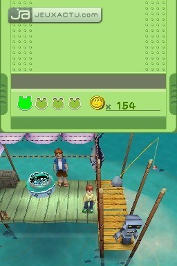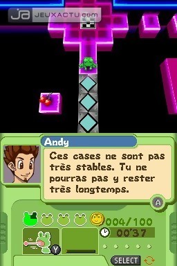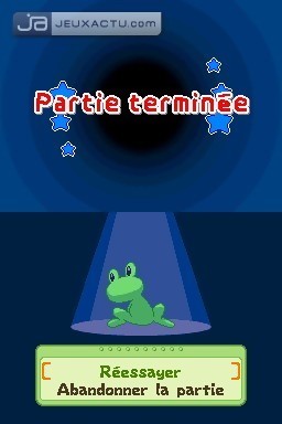 Impossible de passer à côté du phénomène Frogger que vous soyez un gamer de la première heure ou un novice dans le domaine. La petite bouille verdâtre de la grenouille s’est illustrée au fil des ans sur de multiples plates-formes et à de rares exceptions près, son principe n’a pas changé d’un iota. Et c’est à peu près ce qu’a voulu conserver Konami en développant My Frogger Toy Trials sur DS. C’est avec cette appellation des plus joviales que l’éditeur tente de sensibiliser les plus jeunes aux mésaventures de la grenouille la plus célèbre du jeu vidéo. Oubliez les autoroutes surchargées et les rivières infestées de crocodiles, My Frogger Toy Trials vous propose de participer à un tournoi entre gamins. Afin de désigner la meilleure équipe de la compétition, une usine de jouets a concocté un maximum d’épreuves pour départager les participants. D’entrée de jeu, vous contrôlez la bestiole dans des niveaux proches de ses premières aventures, à savoir des parcours jonchés d’obstacles qu’il faut éviter en utilisant avec intelligence la croix directionnelle et les aptitudes de Frogger. Dans son plus simple appareil, le vertébré peut sauter et attraper certains objets avec sa langue. Mais pour pimenter les épreuves, Frogger peut revêtir divers costumes et accéder à de nouveaux pouvoirs afin de progresser dans les niveaux. Ne croyez pas que My Frogger Toy Trials se contente d’une utilisation basique de la console. Pour contrôler son animal de compagnie, vous devez utiliser aussi bien le D-Pad, les boutons X, Y, A, et B que les touches flippers R et L pour le faire pivoter. My Frogger Toy Trials garde le charme des précédents épisodes avec des déplacements case par case. Il faut faire preuve de réflexion pour sortir indemne des épreuves quitte à ramasser quelques bonus de santé ici ou là. Mais au fur et à mesure de la compétition, on remarque que certains paramètres entrent en jeu pour accéder aux différentes finales. En plus de cette jouabilité, vous devez utiliser le stylet et l’écran tactile pour actionner certains mécanismes, pour déplacer Frogger ou pour lui refiler quelques fruits régénérants. Ce n’est pas tout ! My Frogger Toy Trials exploite également le micro de la DS lorsqu’il faut déplacer sa créature sur une embarcation de fortune. En soufflant à plein poumon dans le microphone, vous faites avancer le bateau tout en le dirigeant avec L et R, qui font ici office de gouvernail. Donc grosso modo, My Frogger Toy Trials se découpe en plusieurs séquences de plates-formes nécessitant pas mal de réflexion agrémentées de quelques mini-jeux (course, adresse, combat, sport, danse). Bien que le concept soit facile à comprendre, la difficulté pourra rebuter certains enfants qui s’enfonceront de rage le stylet dans le nez surtout lorsque le jeu basculera de lui-même dans une autre langue : "sprechen sie deutsch ?". Dommage d’autant plus que le soft pourrait séduire ces chères têtes blondes avec des graphismes à mi-chemin entre Animal Crossing et les Sims. A noter également que My Frogger Toy Trials propose une option multijoueur multicartes ou partage de jeu accueillant jusqu’à 4 participants sur certaines épreuves.