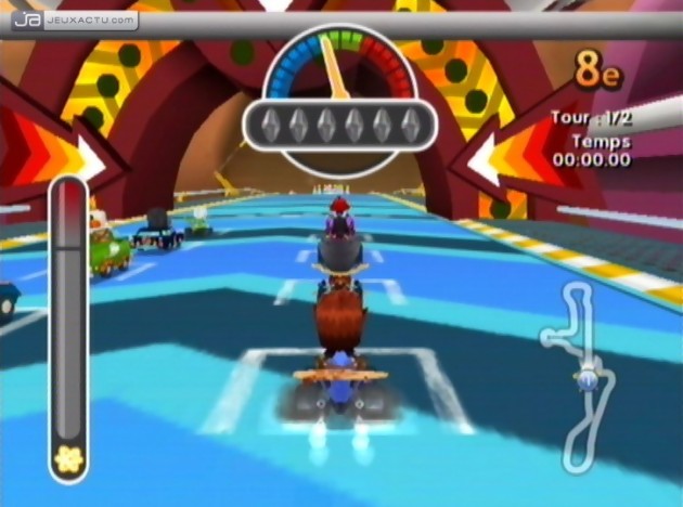 Evidemment, il est difficile de ne pas penser à Mario Kart lorsque l'on découvre pour la toute première fois MySims Racing, puisqu'il s'agit essentiellement d'un jeu de course rose-bonbon où il faudra se frayer un chemin jusqu'à la victoire, en utilisant des armes très prisées au royaume de la guimauve. Les spécialistes du genre savent que les items ont toujours leur mot à dire une fois sur la piste, et MySims Racing regroupe une sélection d'objets plutôt intéressants, à l'image de l'Inverseur Tornade qui contraint les concurrents à piloter temporairement la tête à l'envers. On pourrait également citer le Champ de Force qui neutralise toutes les attaques adverses, ou bien encore le Largueur de Bulles et ses ampoules crystallines paralysantes. Même si certaines armes peuvent paraître frustrantes, aucune d'elles ne permet de ruiner une partie en deux coups de gâchette. En effet, même en disposant intelligemment ses pièges sur le circuit, les concurrents ont toujours la possibilité de remonter au classement en profitant des meilleures armes qui leur tombent quasiment dans le bec. Si l'on soupçonne Electronic Arts d'avoir voulu rendre son titre particulièrement accessible avec des courses où tout le monde a sa chance - même lorsque l'on se retrouve en dernière position -, on aurait également aimé que le talent des pilotes les plus doué soit reconnu. Se faire enfiler par plusieurs pastèques alors que l'on a quasiment mené la course de bout en bout, il n'y a pas plus rageant. D'autant plus que les tracés ne se montrent guère techniques, ce qui là encore pénalise ceux qui font l'effort de prendre les meilleures trajectoires. L'absence d'originalité des circuits est l'autre point faible de MySims Racing, surtout lorsque l'on sait qu'il s'agit d'un facteur déterminant quant au replay value d'un jeu de course Pimouss. Passer d'une course à une autre ne relève d'aucune difficulté particulière, surtout lorsque les virages se ressemblent tous.