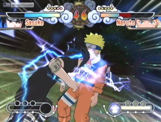 Si ce choix imposé peut paraître comme rédhibitoire pour les fanatiques des sticks arcade, le gameplay de Naruto : Clash of Ninja Revolution - European Version est loin d’être aussi primaire qu’il en a l’air. Mieux, il cache en réalité une certaine stratégie dans l’exécution des combos, si bien qu’on prend un malin plaisir à trouver des alternatives sympas pour faire mordre la poussière à son adversaire. A l’instar du manga, nos ninjas pourront utiliser une technique de substitution, qui permet de se téléporter au-dessus ou derrière son adversaire, au sacrifice d’une pastille de chakra. Il s’agit d’un élément majeur du gameplay, si bien que certains combats se déroulent souvent dans un écran de fumée où chaque belligérant disparaît en laissant derrière lui une bûche en guise de cadeau. Néanmoins, si Naruto : Clash of Ninja Revolution - European Version ressemble comme deux gouttes d’eau à son prédécesseur sur GameCube, il apporte quelques ajouts pas trop dégueulasses, ce qui lui permet de ne pas trop paraître comme un vieux has-been.