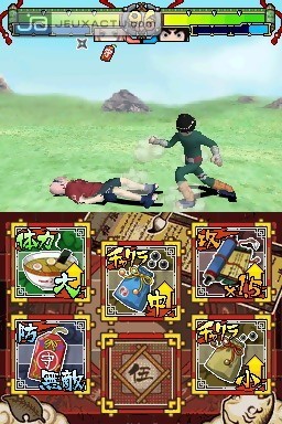 Takara Tomy nous avait promis une réplique quasi parfaite du gameplay des épisodes de Naruto Gekito Ninja Taisen! sur GameCube mais il semblerait que l’éditeur se soit quelque peu laissé emporter par sa joie. Pourtant, les ressemblances avec ce dernier sont là, à commencer par une liste de combos assez proche de son aîné sur GameCube. Les possibilités sont certes assez nombreuses mais l’enchevêtrement de ces attaques manque singulièrement de punch. Est-ce le temps de latence des coups portés à l’écran ou les bruitages quasi inexistants qui sont la cause de cette absence de vélocité dans les combats ? Certainement un peu des deux et ce n’est pas le faible nombre de furie par personnage ni leur mise en scène tout bonnement inexistante qui pourra rehausser un niveau, déjà bien au ras des pâquerettes. On aurait alors pu se tourner du côté des fonctionnalités tactiles de la DS pour varier les plaisirs mais activer quelques items pendant un combat n’a finalement rien d’excitant. L'effet est même néfaste puisque l’utilisation de ces bonus casse quelque peu le rythme déjà bien mou des affrontements. En effet, chaque protagoniste débute un match avec un nombre bien défini d’items, à utiliser librement lors des différents rounds. Chaque bonus se caractérise par leurs effets plus ou moins efficace comme la gourde de soin qui permet par exemple de gonfler à bloc sa jauge de vie, tandis que la brioche de riz permet de retrouver un peu de santé. De la même manière, il est possible d’enfiler une armure afin de se protéger des attaques que l’on soit en garde ou pas. A l’inverse, d’autres bonus offrent la possibilité d’accroître ses attaques et d’engendrer davantage de dégâts lors des coups portés à l’adversaire. Des bonus censés apporter un brin de technicité dans le gameplay, mais leur utilité ne fait que plomber davantage les combats. Que reste-t-il à ce Naruto : Ninja Destiny pour tenter de se rattraper ? Pas grand chose, d’autant que la réalisation du titre fait également pâle figure. Des personnages modélisés au taille-crayons, des textures baveuses, des couleurs bien ternes et des décors quasi vides, la DS nous avait habitué à bien mieux, même si sa grande qualité n’est pas de briller en 3D. Aïe, aïe, aïe…