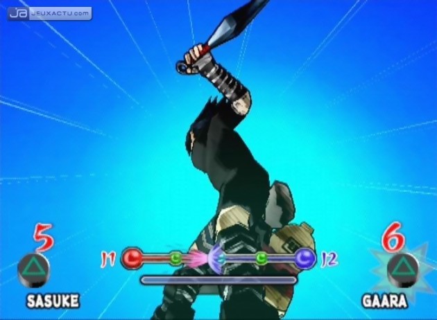 Le système de combat dans Naruto : Ultimate Ninja 2 n’a d’ailleurs pas trop changé. On retrouve les mêmes attaques pour la plupart des belligérants, avec tout de même quelques mises à jour afin de coller avec l’actualité de l’histoire. Sasuke par exemple est revenu de son entraînement intensif avec Kakashi. Il arbore donc sa seconde tenue, plus classe, et dispose donc d’attaques plus destructrices. On retrouve également le système de plans, franchement pas très utiles mais qui permet aux lâches de prendre la poudre d’escampette. Pas de grands changements concernant les Ougis - ces fameuses cinématiques interactives où le joueur doit appuyer sur une série de boutons sans la moindre faute, afin de déclencher son jutsu et ainsi provoquer le maximum de dégâts à l’adversaire – si ce n’est l’introduction de nouvelles épreuves où il faut désormais appuyer comme un forcené sur le bouton demandé pour remporter le duel. Ceux qui excellaient dans les vieux épisodes de Track & Field devraient être aux anges. On notera également la possibilité de choisir des partenaires que l’on peut appeler à des moments bien précis pour se dépatouiller d’une situation délicate où à l’inverse enfoncer davantage le clou. Authenticité oblige, ces seconds couteaux sont choisis par avance par le CPU, ne laissant qu’un choix très restreint au joueur. Naruto accompagné de Gaara ou de Zabuza, il ne faut même pas y compter. C’est bien regrettable d’ailleurs. Comme bon nombre de jeux de baston qui se mettent à jour chaque fin d’année, Naruto : Ultimate Ninja 2 joue la carte de la surenchère. Plus de personnages, plus d’arènes, plus d’attaques, plus de combos, voilà de quoi contenter les amoureux de la castagne virtuelle, d’autant que ce second épisode à voir le jour en Europe permet toujours de passer le jeu en langue japonaise. Et ça, c’est un luxe qu’on ne se refuse pas !