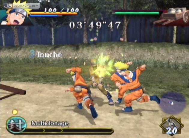 Dans la peau de Naruto, l’objectif ici sera d’enchaîner plusieurs missions de divers rang (A, B, C, D et S) imposées par le Hokage, le chef du village, comme c’est souvent le cas dans le manga. Notre héros évolue sur une carte où il peut se rendre à des points bien précis. Aider une jeune femme à faire la pub de son magasin pour empêcher la faillite, éliminer des espions qui rôdent autour des portes de Konoha ou bien encore se rendre à un autre village pour porter secours aux plus démunis, quelque soit la mission, elle aboutit systématiquement à une séance de combat. Concernant la palette de coups, si elle apparaît de prime abord conséquente, on se rend rapidement compte qu’on en fait le tour très rapidement. Multi-clonage, lancers de kunais ou de shurikens et autres Rasengan, voilà à peu près les techniques possibles de Naruto. Les combos sont bien d’actualité mais leur manque de variété aboutit à un système de combat finalement assez répétitif, et ce malgré la présence d’une boutique où il est possible d’acheter des armes supplémentaires. Bien évidemment, la zone d’exploration au départ est restreinte et c’est en avançant dans le jeu que Naruto peut accéder à d’autres lieux connus de la série. Seulement voilà, durant ses balades sur la carte, Naruto sera sujet à des assauts aléatoires, à l’ancienne, comme dans un vieux Final Fantasy. Pas la meilleure idée d’autant que ces attaques "inattendues" ont généralement lieu aux mêmes endroits. Bref, pour l’effet de surprise on repassera.